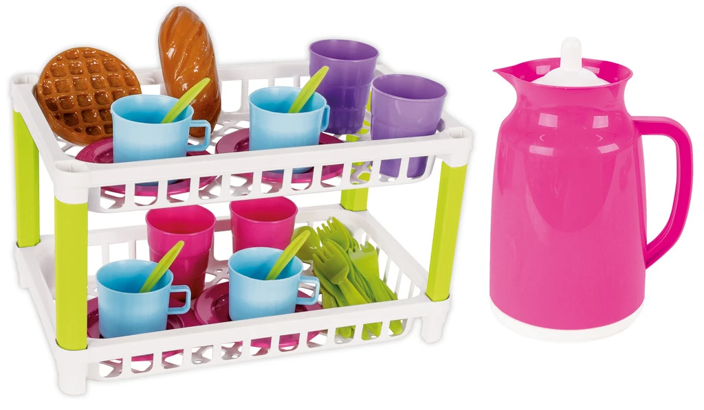 Obsahuje celkom 31 dielov – poličku, hrnčeky, tanieriky, kanvicu, príbory, vafle a ďalšie doplnky, vďaka ktorým si deti môžu vytvárať vlastné kuchynské príbehy plné fantázie.
