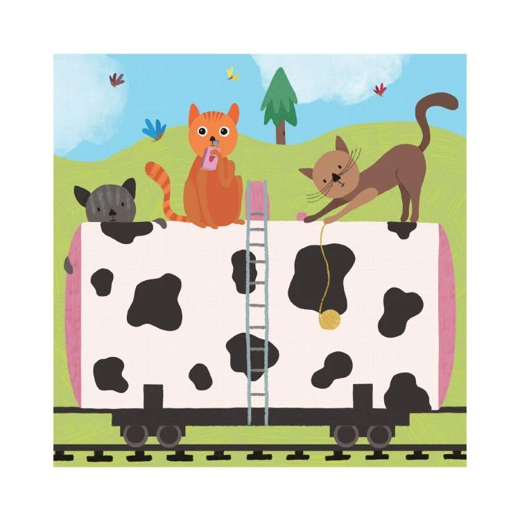 Kniha Vlakom celým rokom je prvým titulom vo formáte rozkladacieho harmonikového leporela a je tak vhodná aj pre tých najmenších čitateľov. Jedna strana leporela je venovaná nákladnému vlaku a zvieratkám, druhá strana potom osobnému vlaku plnému cestujúcich.
