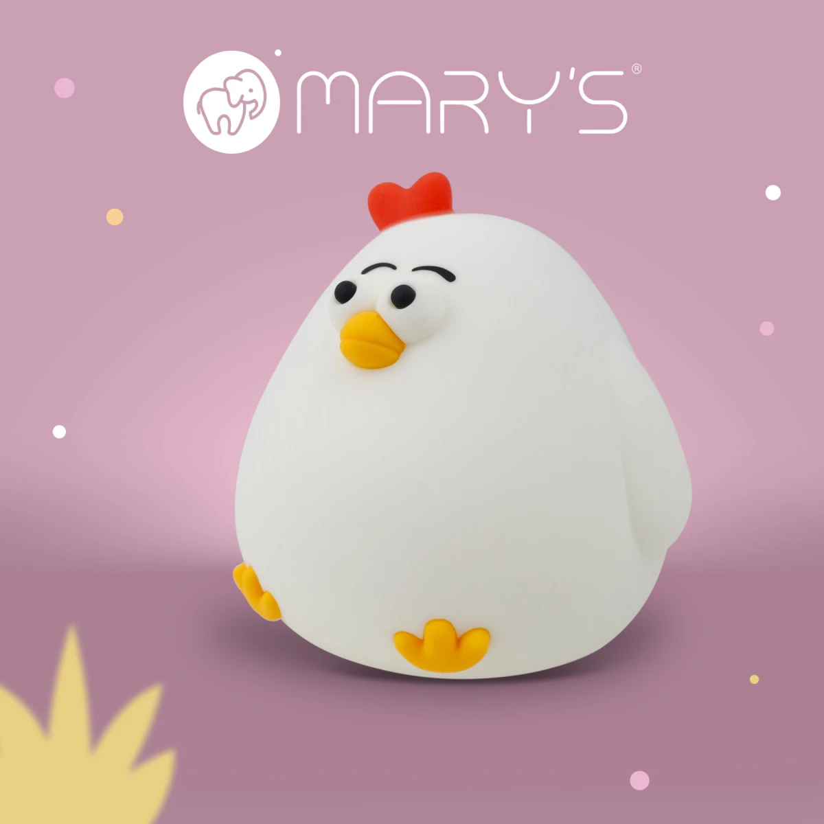 Roztomilá silikónová LED nočná lampička Mary's v tvare sliepočky prináša do detskej izby jemné, upokojujúce svetlo a hravú atmosféru, ktorá pomáha deťom pokojne zaspať a zároveň oživí každý kút miestnosti svojou veselou a priateľskou podobou.
