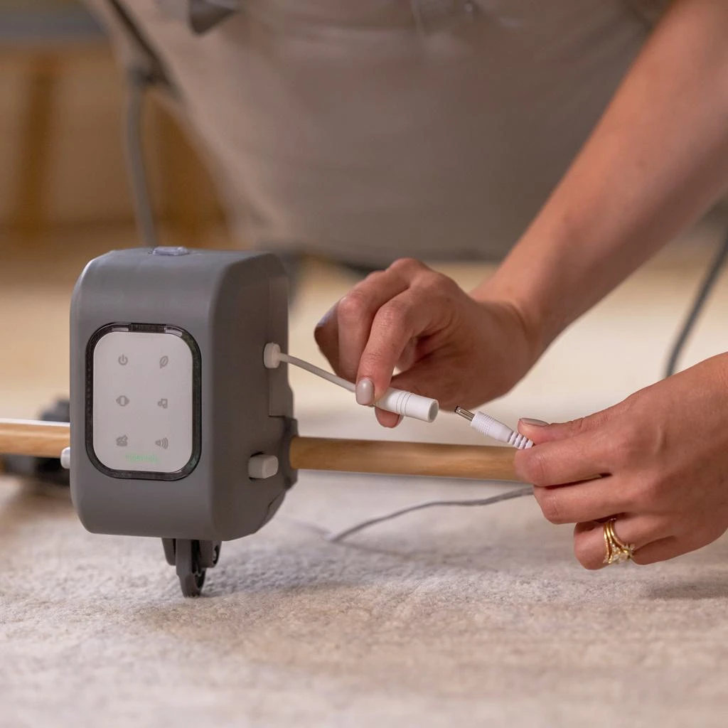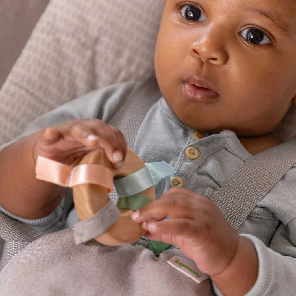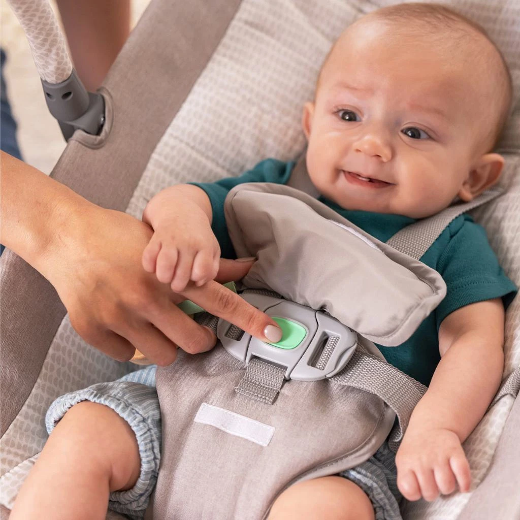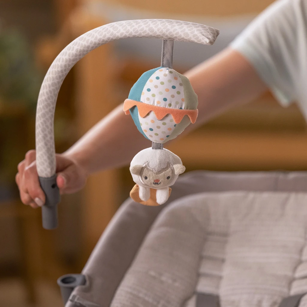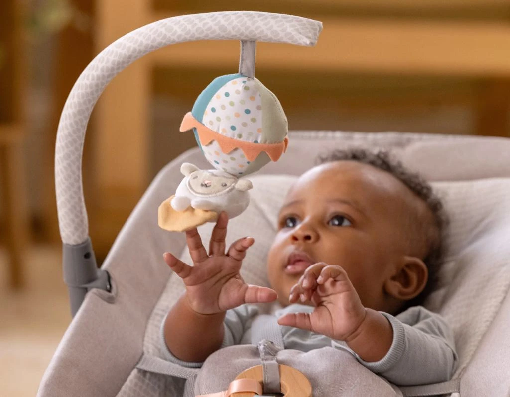 - Ovládanie je intuitívne vďaka technológii GentleTouch™, ktorú hravo zvládnu rodičia, starí rodičia aj opatrovatelia. Vaše dieťa sa môže zabaviť s odnímateľnou hrazdičkou, na ktorej visí plyšový balón a drevený krúžok so štítkami na skúmanie.