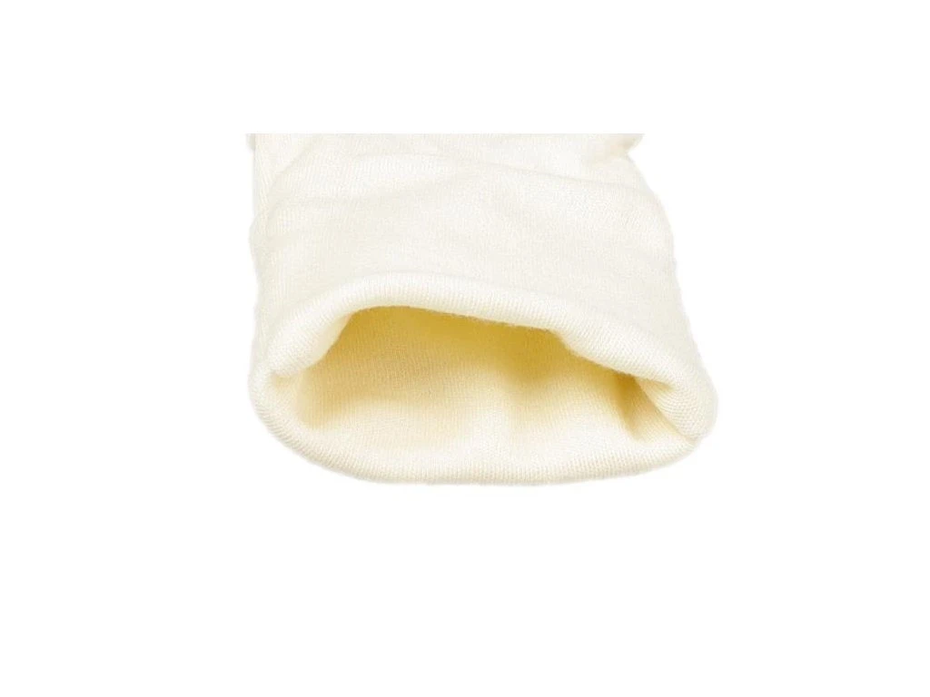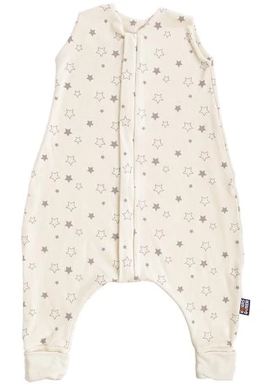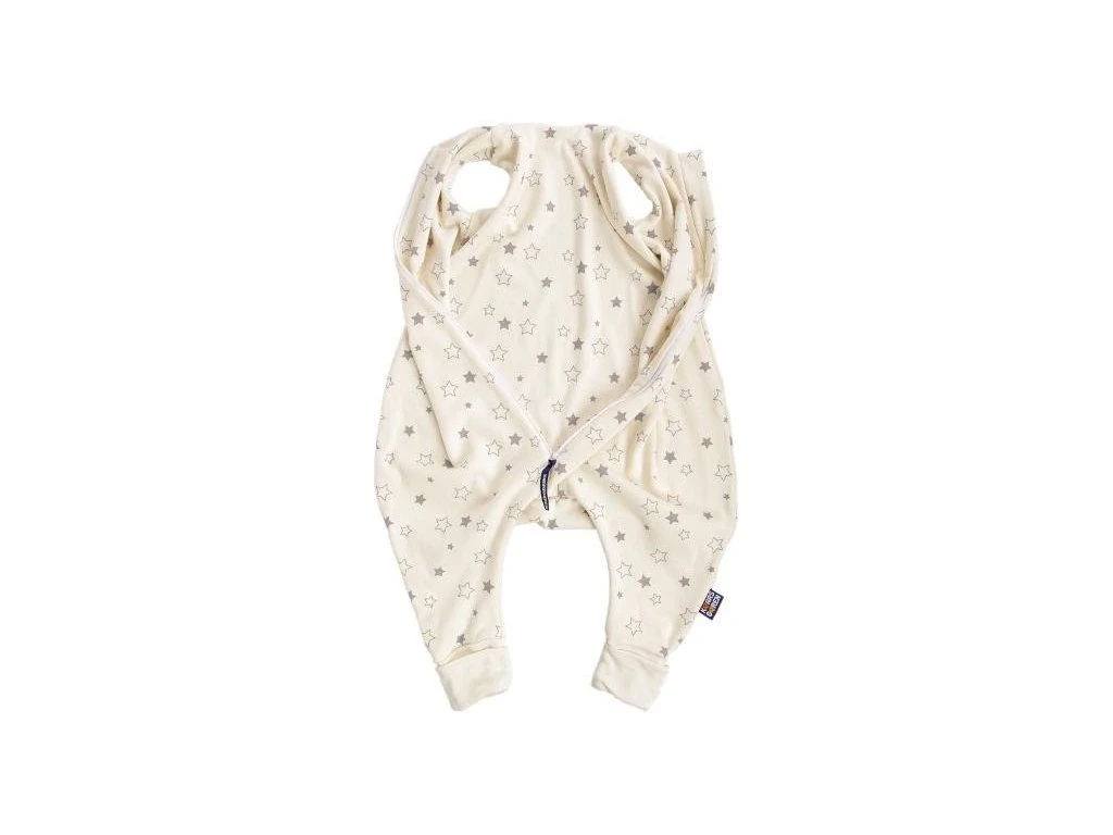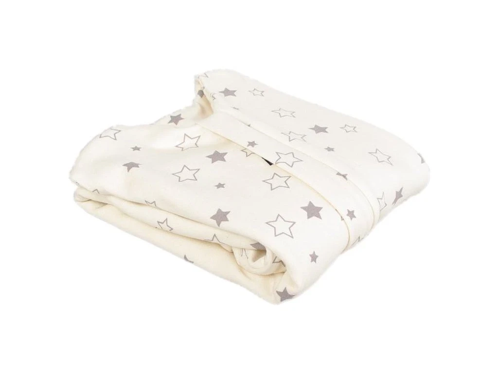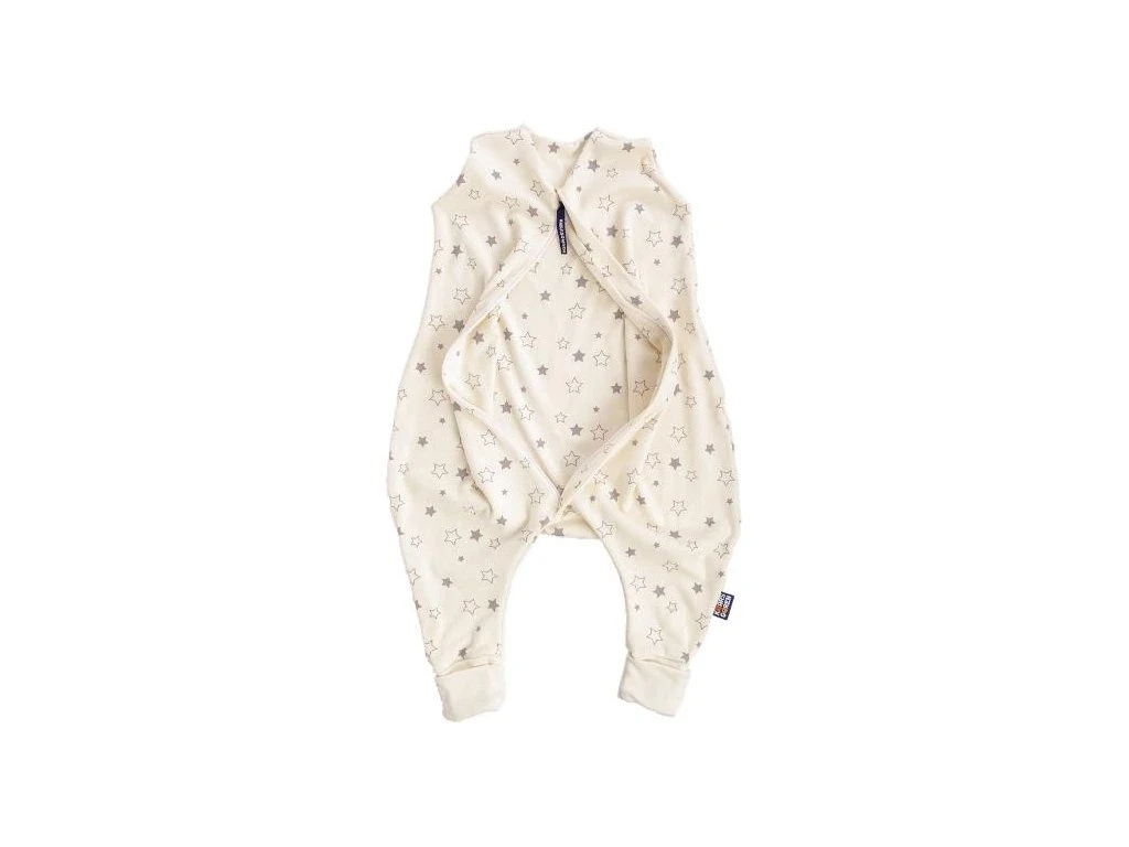 Letný spací vak pre novonarodené bábätko s otvormi na nohy v prírodnej farbe s motívom šedých hviezdičiek, bábätko v ňom môže voľne kopať nožičkami. Spací vak má uprostred zips a je možné ho úplne otvoriť, navyše má zips látkovú krytku, ktorá zabraňuje privretiu krku do zipsu.
