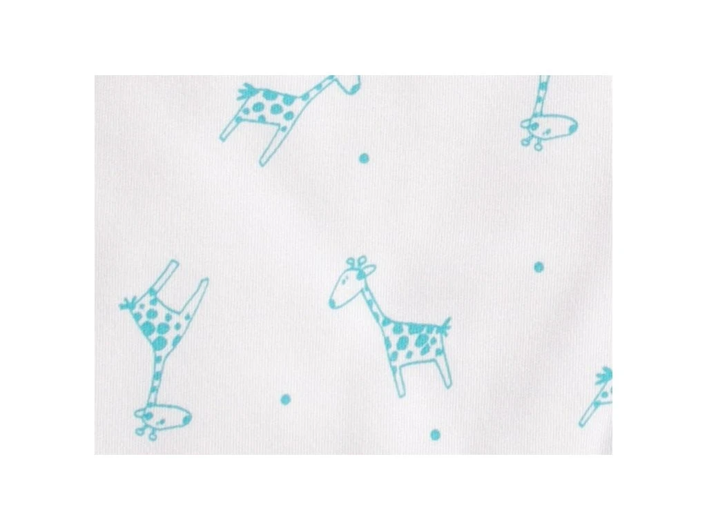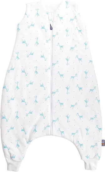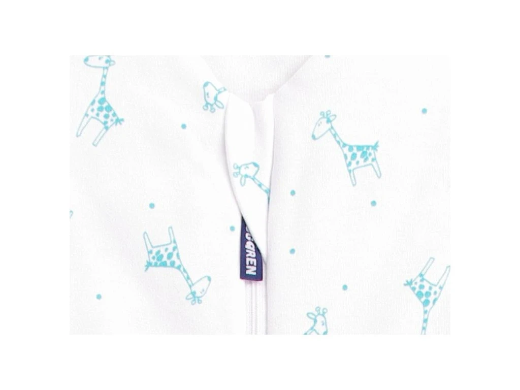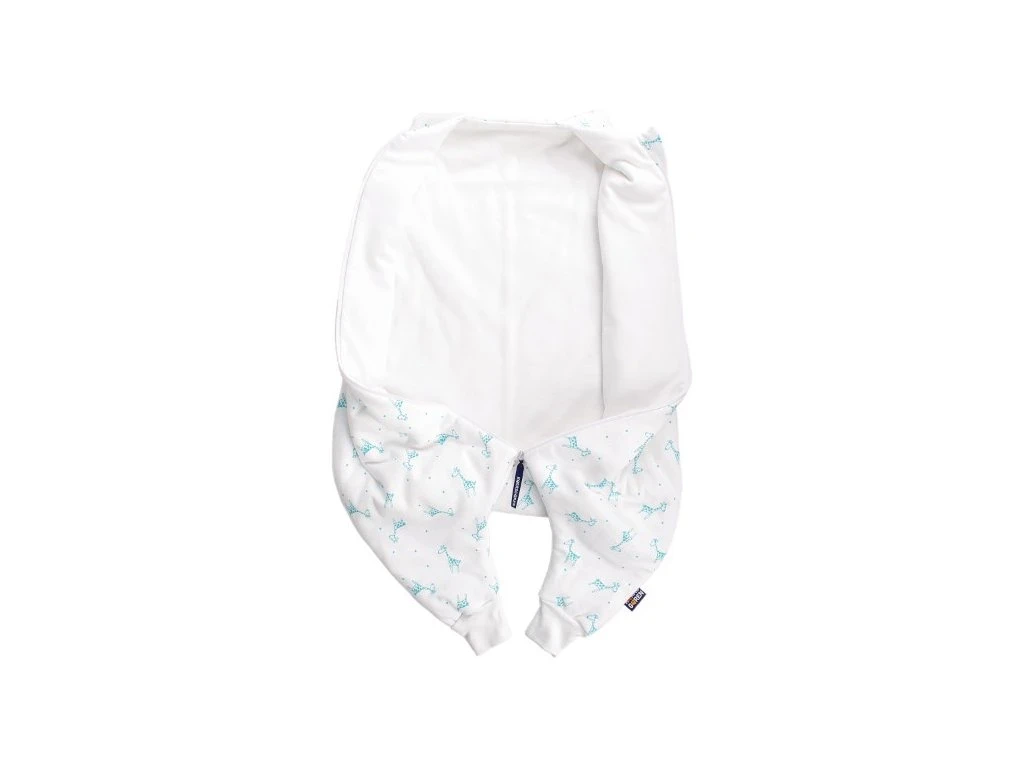 Detský letný spací vak s otvormi na nohy v bielej farbe s motívom žirafiek vo farbe aqua. Spací vak má uprostred zips a je možné ho úplne otvoriť, navyše má zips látkovú krytku, ktorá zabraňuje privretiu krku do zipsu.