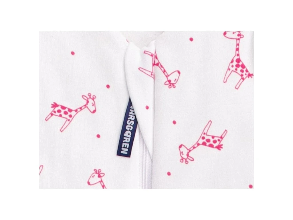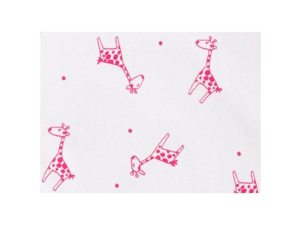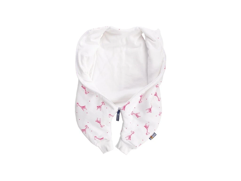 Letný spací vak pre novonarodené bábätko s otvormi na nohy v bielej farbe s motívom červených žirafiek, bábätko v ňom môže voľne kopať nožičkami. Spací vak má uprostred zips a je možné ho úplne otvoriť, navyše má zips látkovú krytku, ktorá zabraňuje privretiu krku do zipsu.