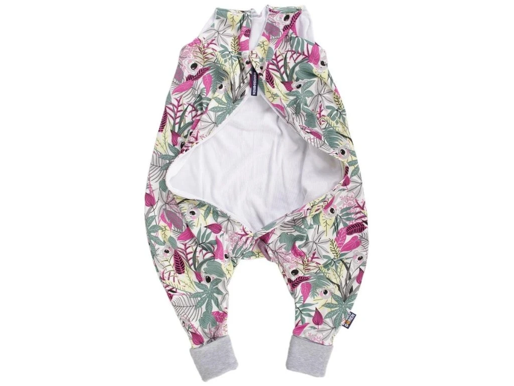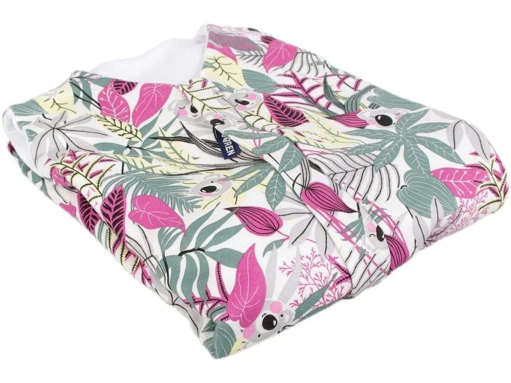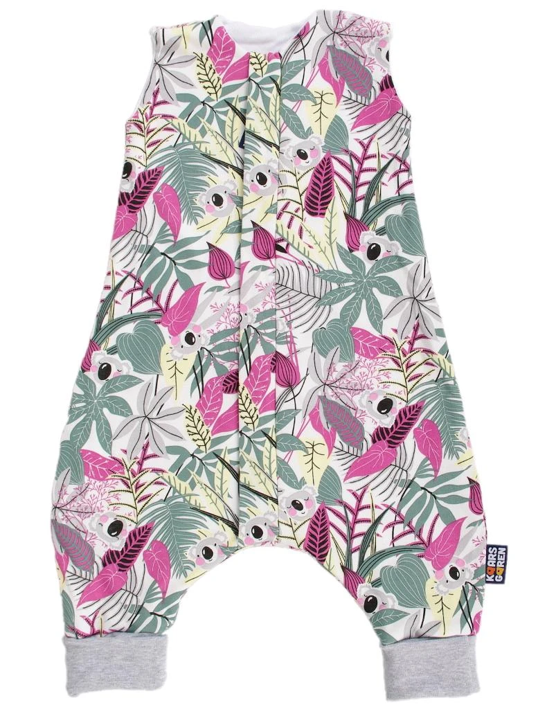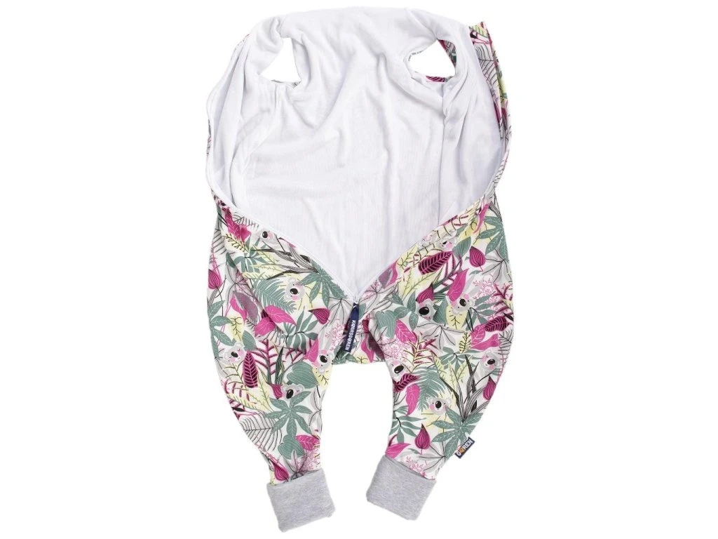 Letný spací vak pre bábätko s otvormi na nohy v ružovej farbe s motívom koal, bábätko v ňom môže voľne kopať nožičkami. Spací vak má uprostred zips a je možné ho úplne otvoriť v oboch smeroch, navyše má zips látkovú krytku, ktorá zabraňuje privretiu krku do zipsu. Náplety u nožičiek je možné prehnúť a použiť ako integrované ponožky.
