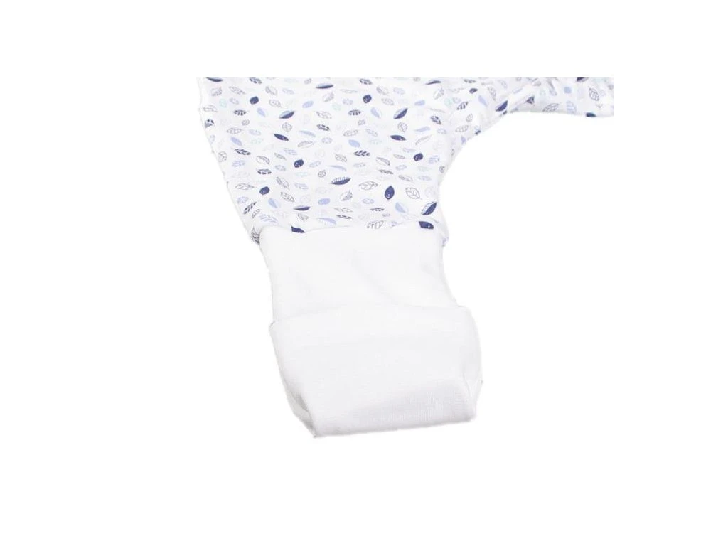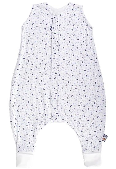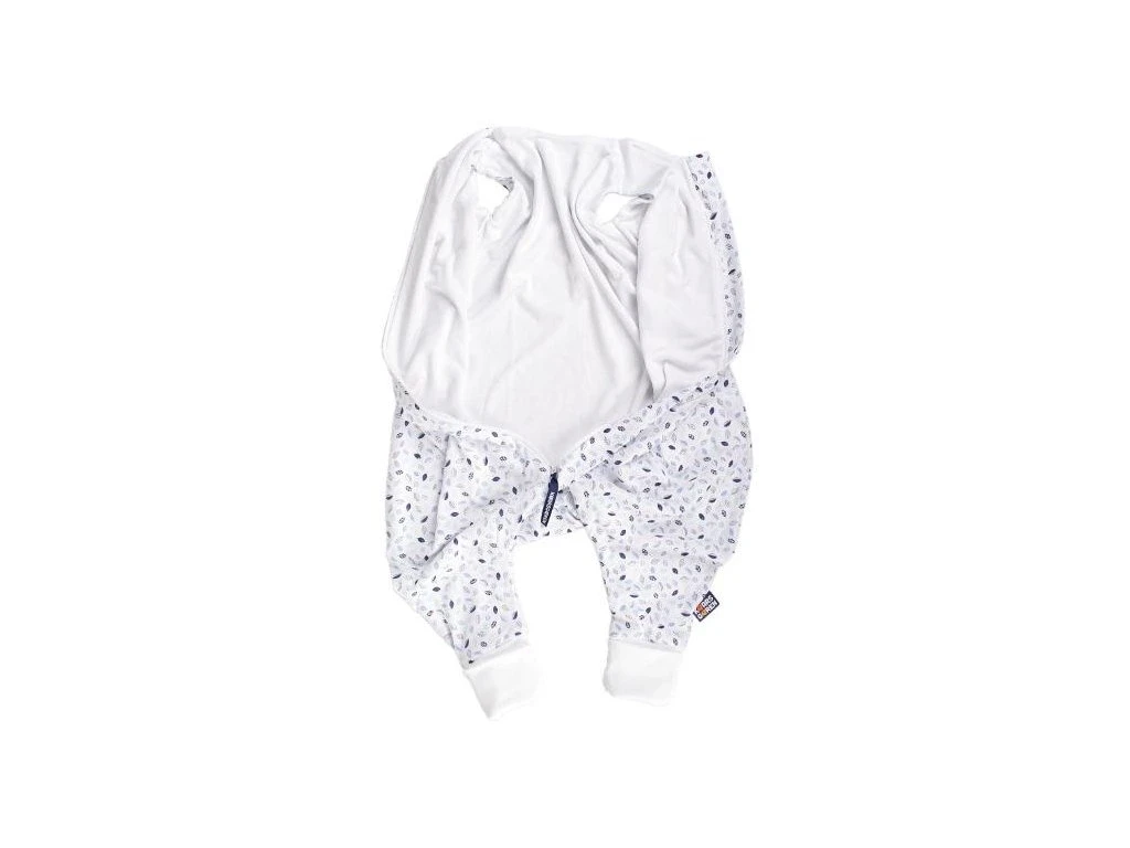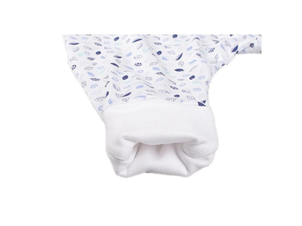 Letný detský spací vak s otvormi na nohy s motívom modrých lístočkov, dieťa v ňom môže voľne kopať nožičkami. Spací vak má uprostred zips a je možné ho úplne otvoriť v oboch smeroch, navyše má zips látkovú krytku, ktorá zabraňuje privretiu krku do zipsu.