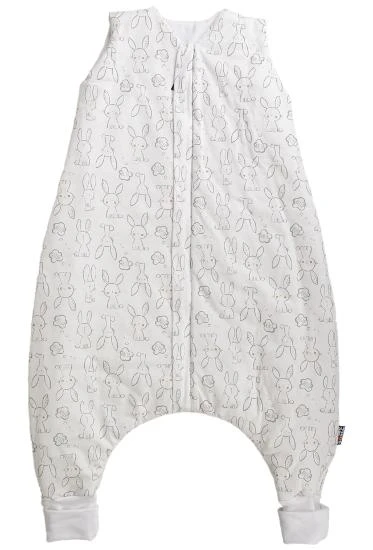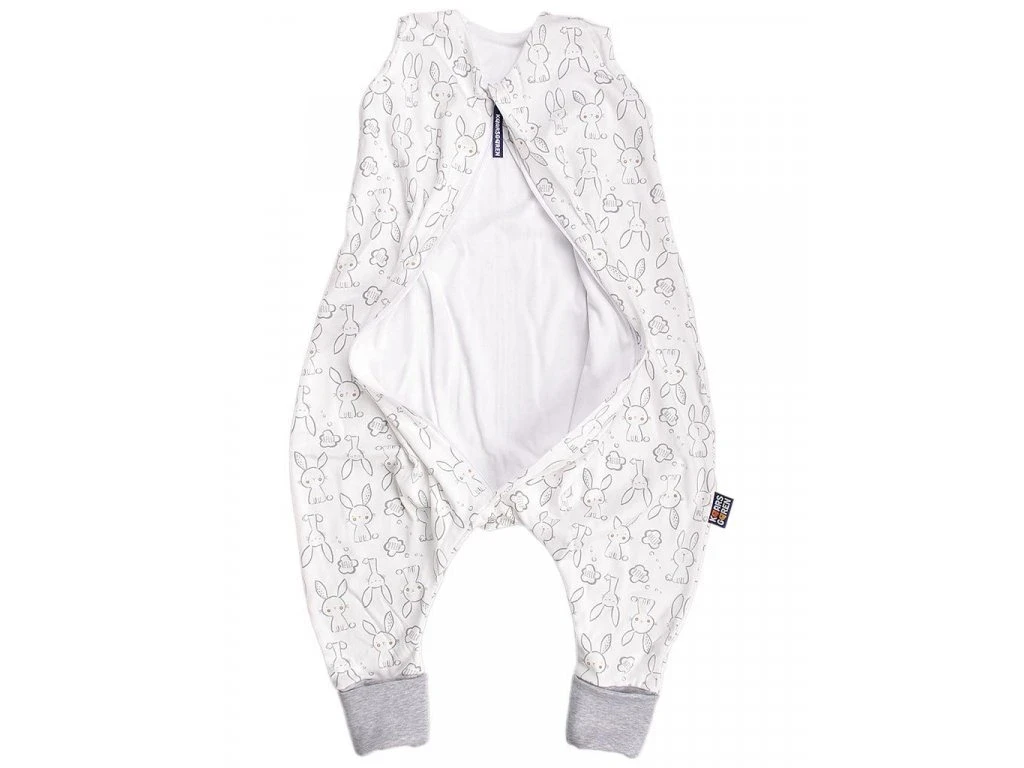 Letný spací vak pre bábätko s otvormi na nohy v smotanovej farbe as motívom zajačikov, bábätko v ňom môže voľne kopať nožičkami. Spací vak má uprostred zips a je možné ho úplne otvoriť v oboch smeroch, navyše má zips látkovú krytku, ktorá zabraňuje privretiu krku do zipsu. Náplety u nožičiek je možné prehnúť a použiť ako integrované ponožky.