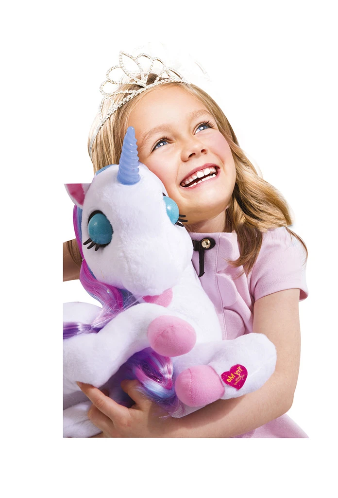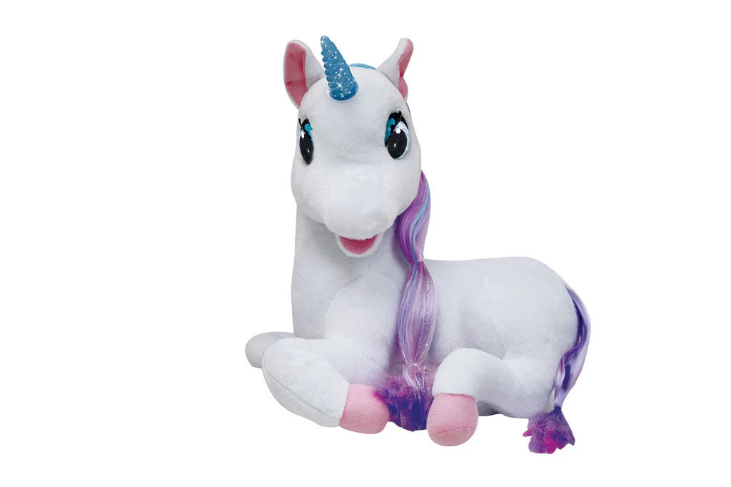 Jednorožec má dlhú fialovo-ružovú hrivu a chvost, ktoré dodávajú hračke rozprávkový vzhľad. Jeho výrazné modré oči sa pri hraní pohybujú, čo vytvára dojem živej postavy, a modrý roh na čele svieti magickými farbami, čo ešte viac podčiarkuje kúzelný charakter tejto hračky.
