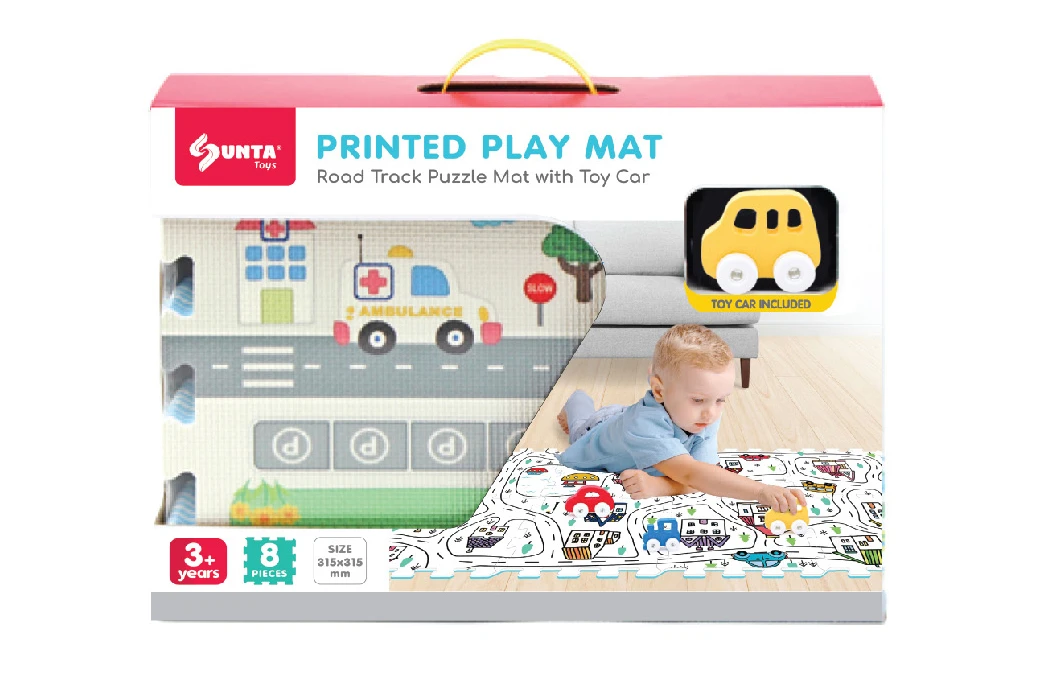 Obsahuje 8 blokov 31,5x31,5x1 cm, autíčko s voľnými kolesami.