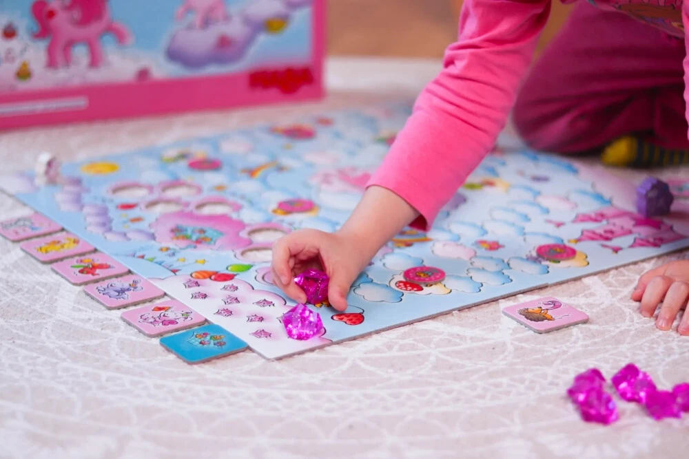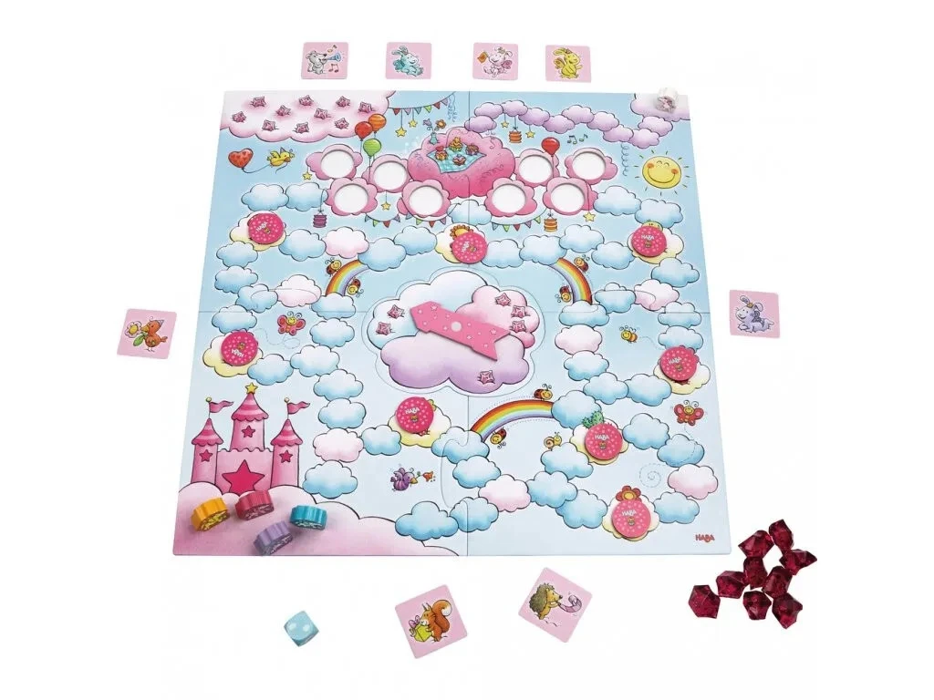Obsah hry 4 jednorožce: Trblietavé šťastie (tmavo ružový), Hviezdny prach (žltý), Kúzelný kvet (fialový), Magický vír (tyrkysový), 1 malý jednorožec Rosalie (ružový), 1 kocka, 1 herná doska s rotujúcou šípkou, 8 priateľov, 10 obláčikových kryštálov, 1 pravidlá hry.