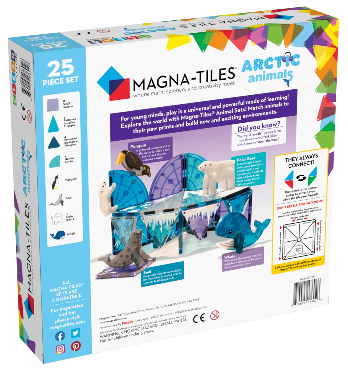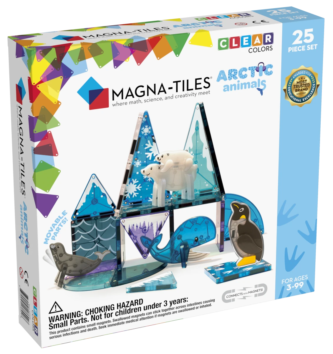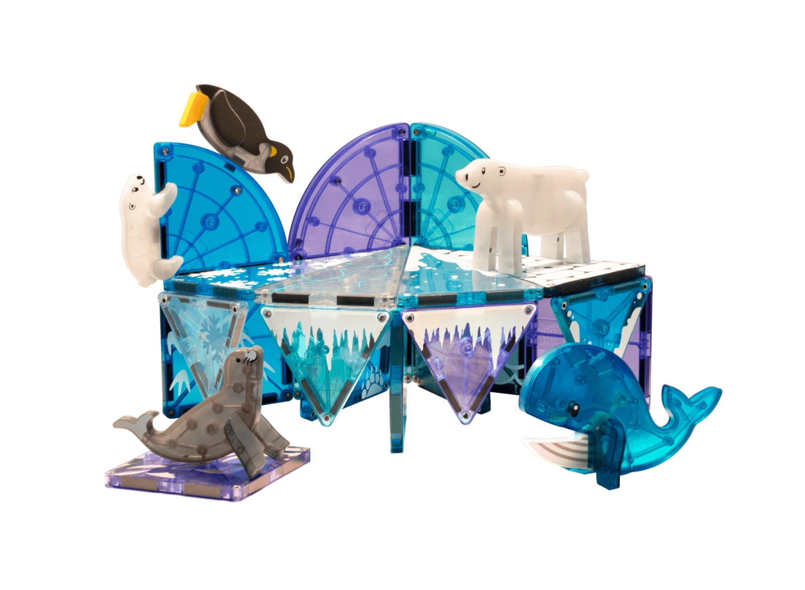 Postavte si svoju vlastnú arktickú krajinu s fascinujúcou magnetickou stavebnicou MAGNA-TILES® Arctic – 25 dielov . Táto originálna súprava deťom umožní vytvárať svet plný ľadových plôch, zvieracích stôp a polárnych zvierat. Obsahuje päť roztomilých figúrok – tučniaka, tuleňa, mláďa ľadového medveďa, dospelého ľadového medveďa a veľrybu – spolu s priehľadnými magnetickými dielikmi, ktoré pripomínajú ľad a sneh.