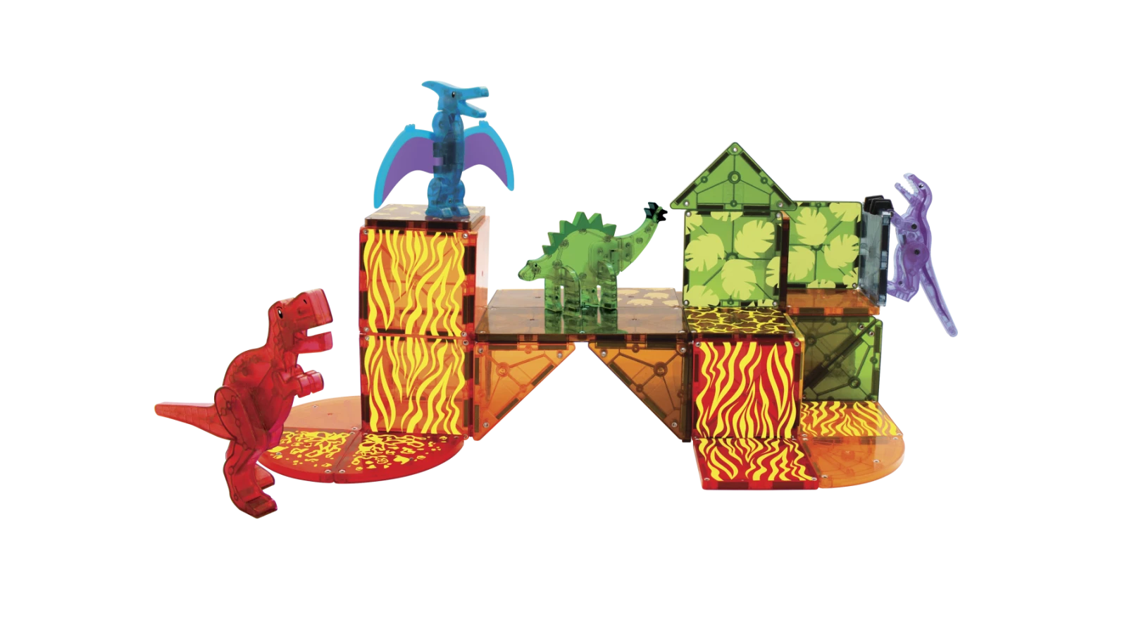Súčasťou sady sú štyri veľkí dinosaury s pohyblivými časťami - Pteranodon (modrý), T-Rex (červený), Stegosaurus (zelený) a Velociraptor (fialový) - a pestré magnetické dieliky so sopečnou tematikou , ktoré prinášajú do hry živosť aj napätie. Deti môžu stavať sopky, jaskyne alebo celé jurské scény a rozvíjať tak svoju fantáziu, jemnú motoriku aj priestorovú predstavivosť.
