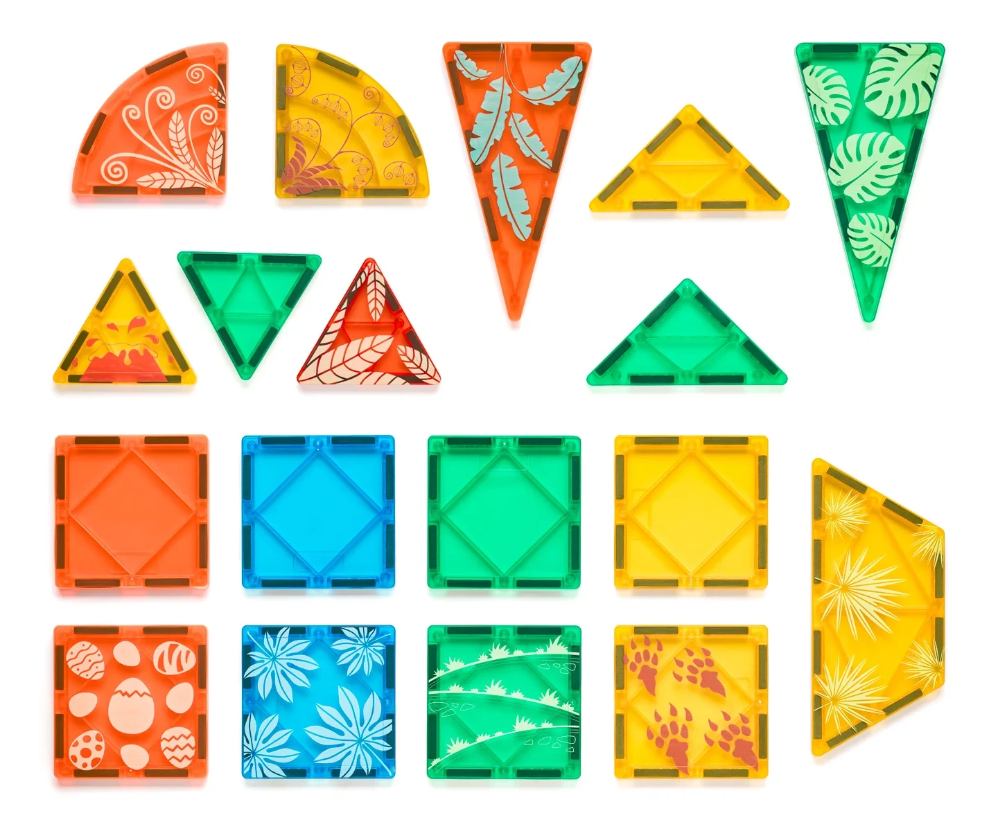 Obsah sady - 23 dielikov: 8 štvorcových dielikov, 7 trojuholníkových dielikov, 2 polkruhové dieliky, 1 štvoruholníkový dielik, 5 dinosaurov.