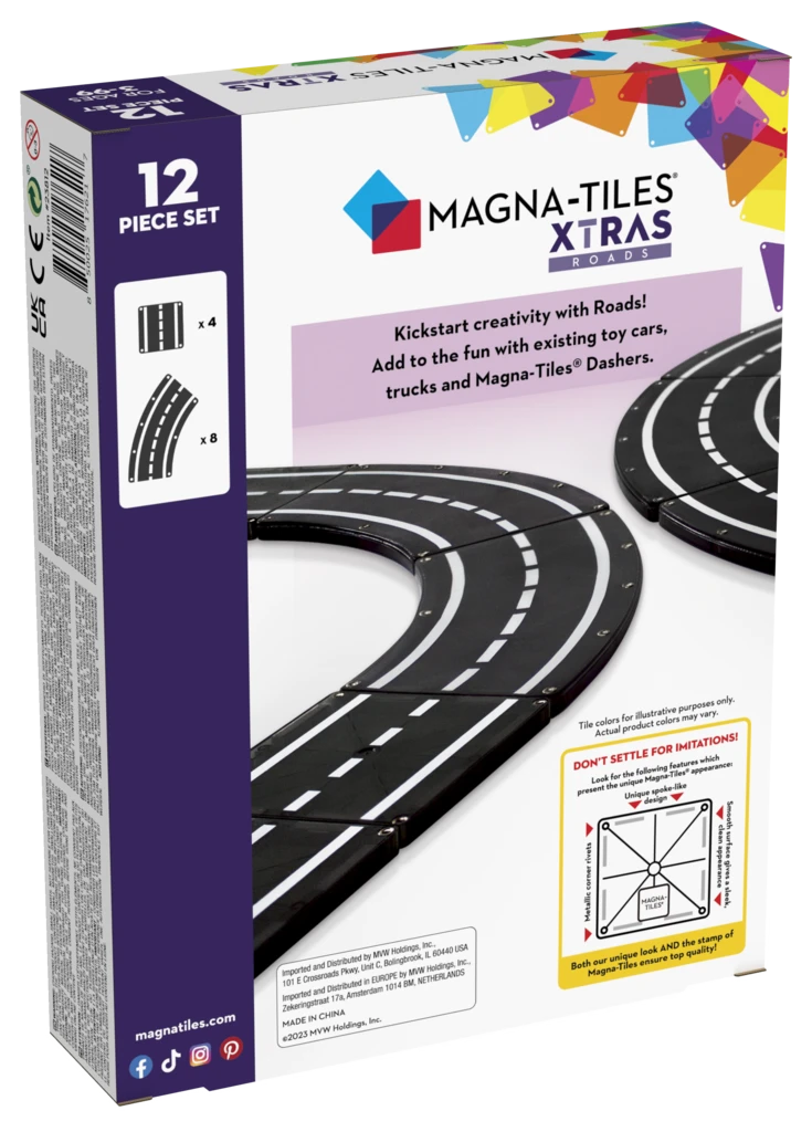 Sada obsahuje všetko potrebné na dokončenie dokonalého kruhu (8 kriviek) alebo oválnej závodnej dráhy (8 kriviek + 4 štvorce). Stavebnica je kompatibilná so všetkými ostatnými sadami Magna-Tiles, takže možnosti kombinovania a rozširovania sú takmer nekonečné.