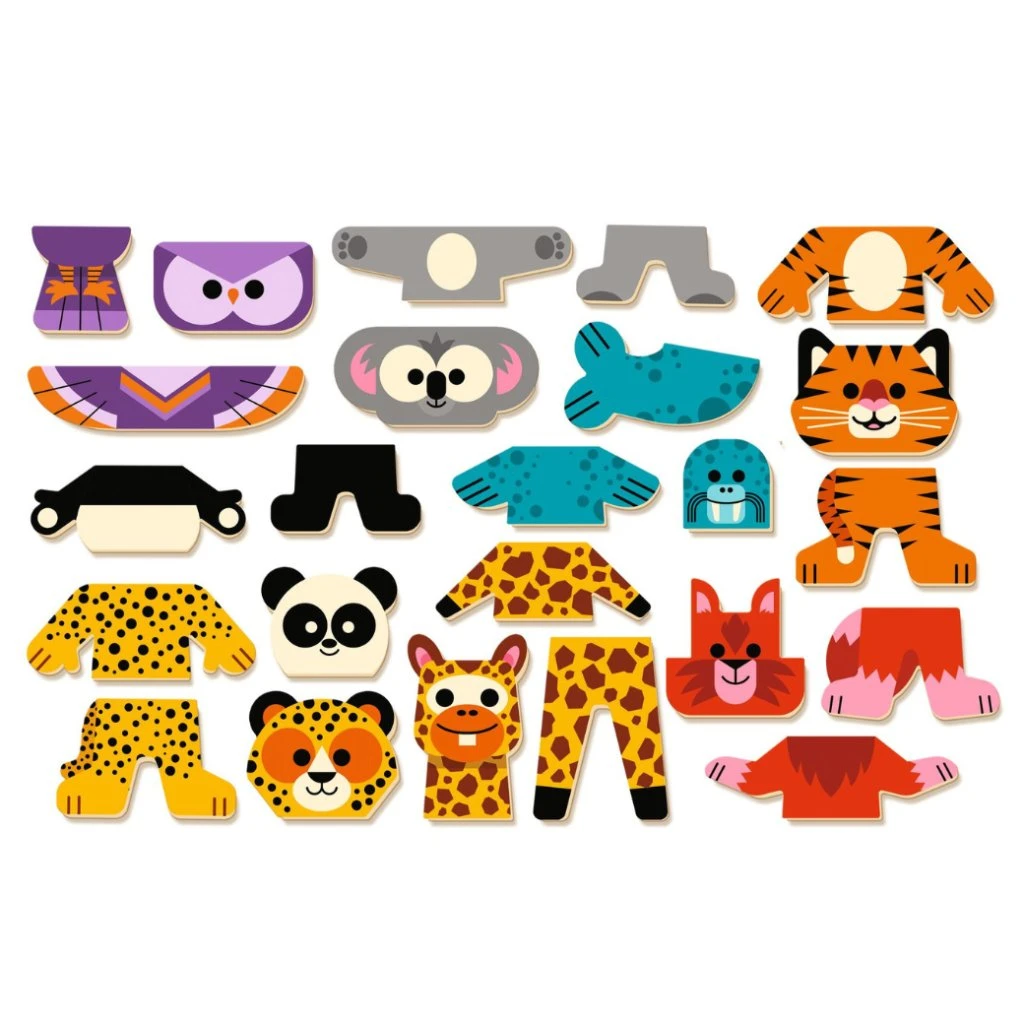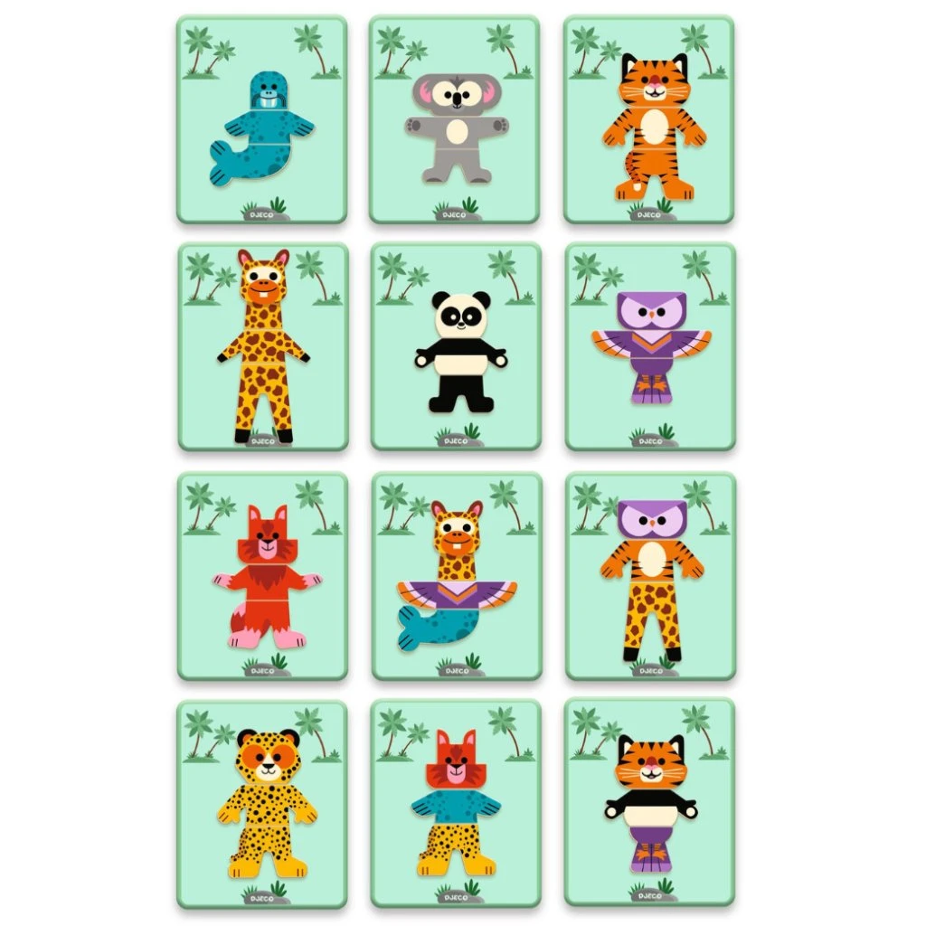 Obsah: 1 tenká kovová krabička ilustrovaná z oboch strán, 24 magnetických drevených dielikov, 6 obojstranných šablón (12 predlôh).