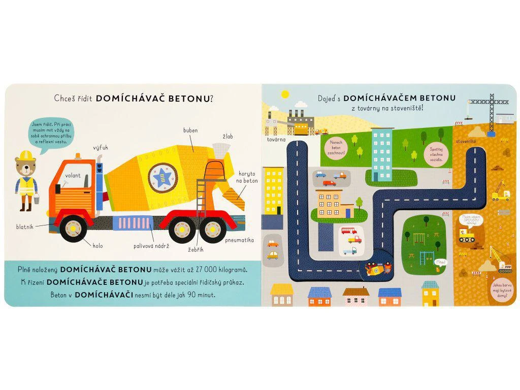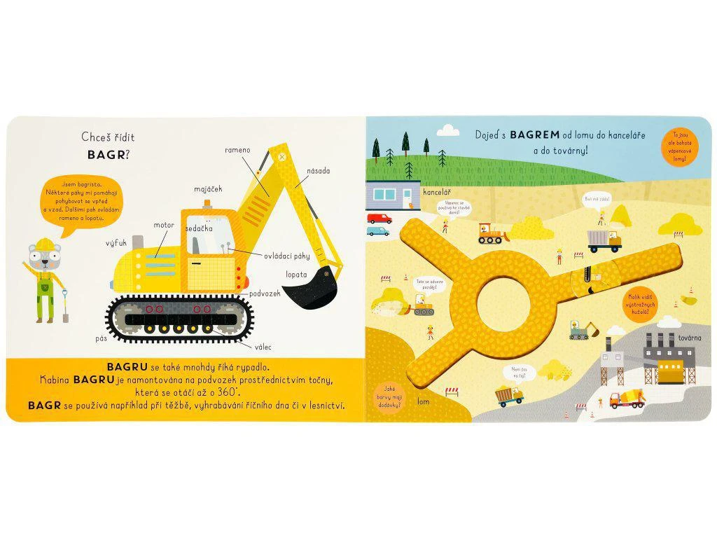 Zisti o stavebných strojoch množstvo zaujímavostí a pomocou popisov u každého z nich sa dozvieš, z čoho sa skladajú. Potom sa s posuvnými kolieskami môžeš prejsť po trasách po najrôznejších staveniskách a spoznať aj ich! Vieš, koľko môže vážiť domiešavač betónu? Ako sa riadi bager a kde sa na nakladači nachádza lopata? To a veľa ďalšieho sa dozvieš v tomto hravom, ale aj veľmi poučnom leporele s posuvnými kolieskami.