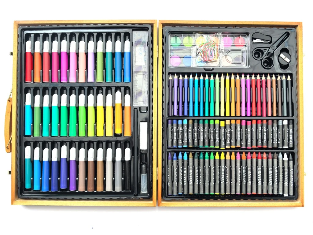 Tento elegantný kufrík ponúka 150 kusov výtvarných potrieb, starostlivo usporiadaných do prehľadných priehradok. Vďaka pevnému drevenému prevedeniu s praktickým úchytom sa ľahko prenáša a je ideálny na použitie doma, v škole aj na cestách.