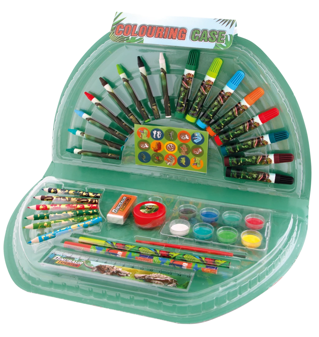 Súčasťou kufríka sú fixky, voskovky, pastelky, vodové farby, obyčajné ceruzky, štetec, pravítko, strúhadlo, guma a tiež samolepky s dinosaurami, ktoré dodajú každému výtvoru jedinečný štýl.