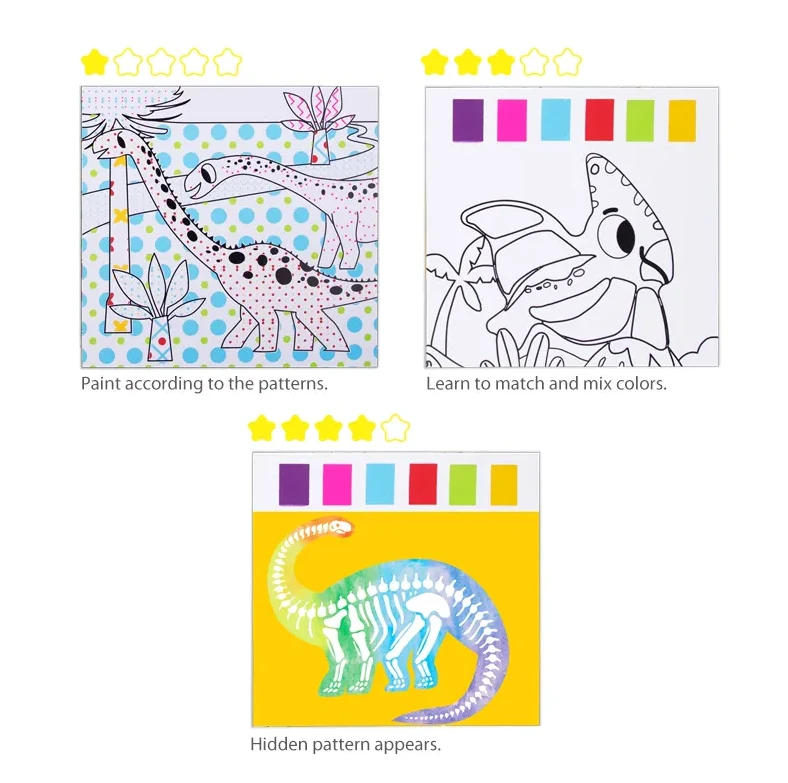 Maľovanie vodou Dinosaury – 24 omaľovánok prináša deťom kúzelnú zábavu bez neporiadku, pri ktorej sa po prejdení štetcom s vodou objavujú farební dinosaury a fascinujúci praveký svet.
