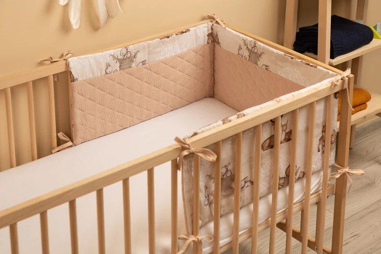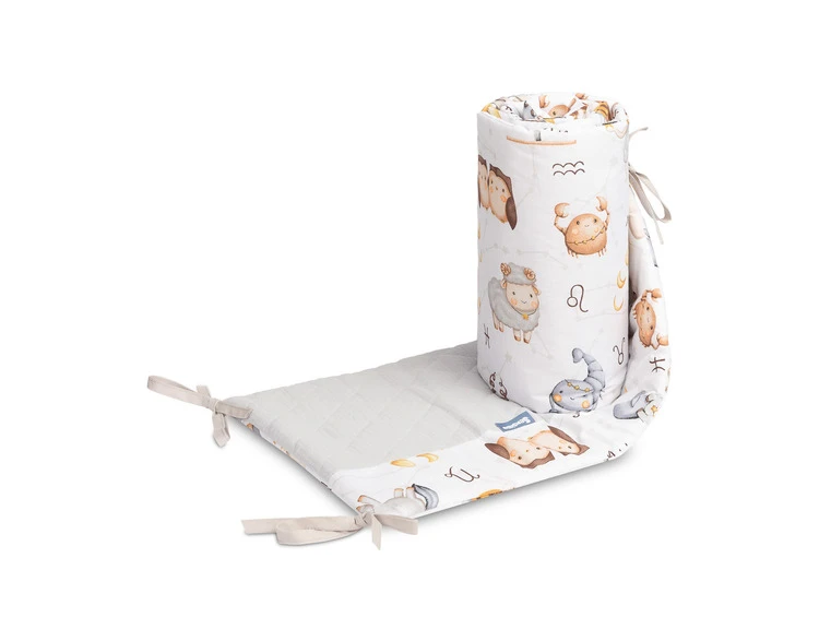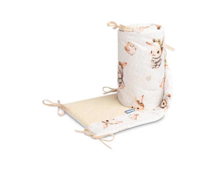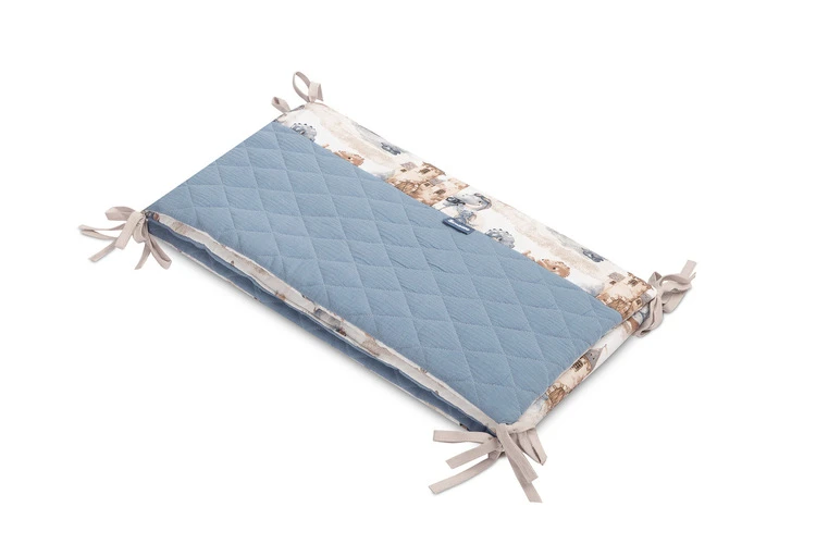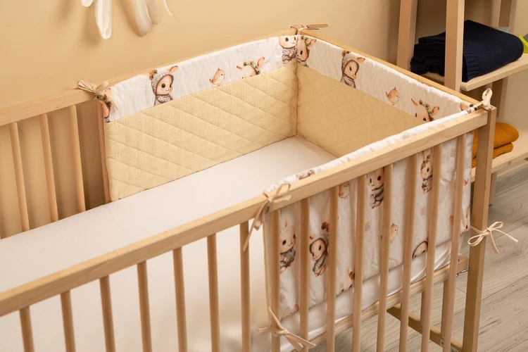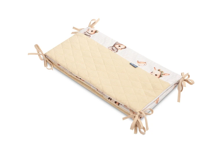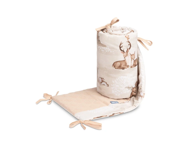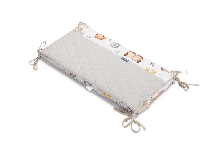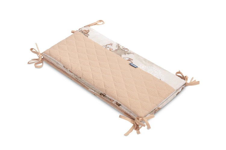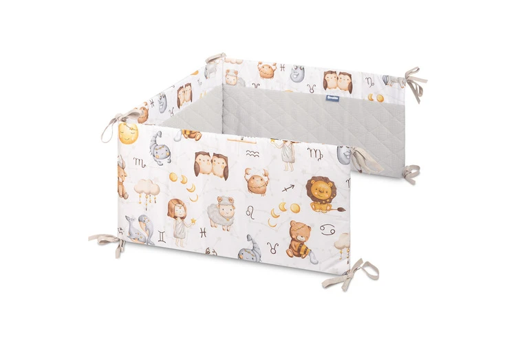 Mantinel je vyrobený z mäkkej bavlny s potlačou a jemného mušelínu, ktorý je príjemný na dotyk. Výplň z polyesteru chráni dieťa pred prípadnými nárazmi o priečky postieľky. Pripevnenie pomocou praktických šnúrok zaisťuje, že mantinel vždy zostane na svojom mieste.