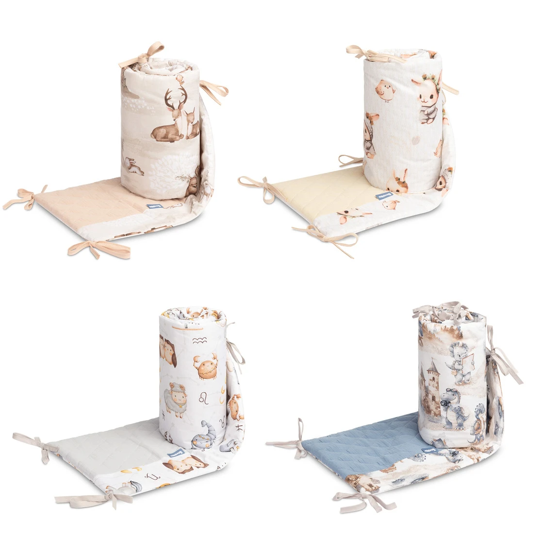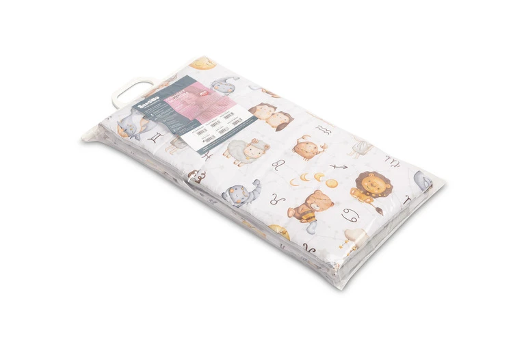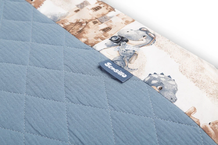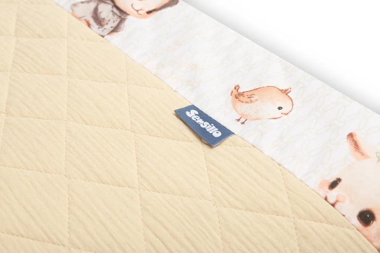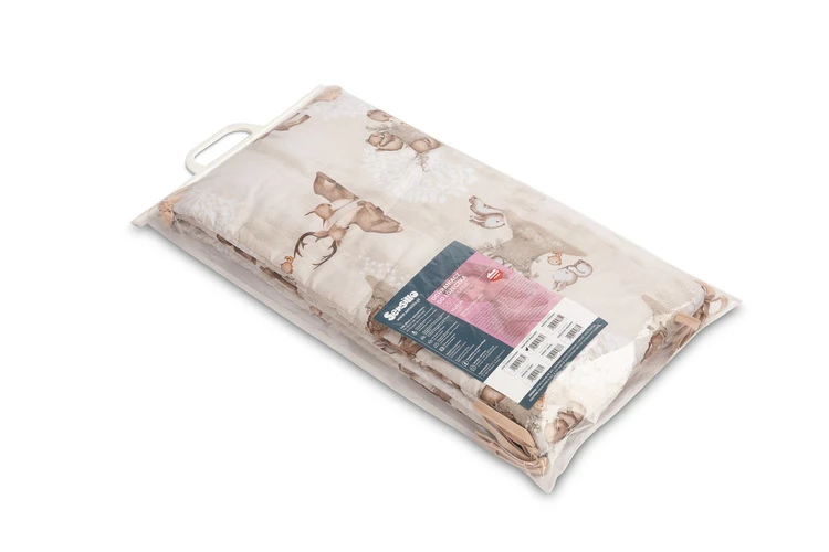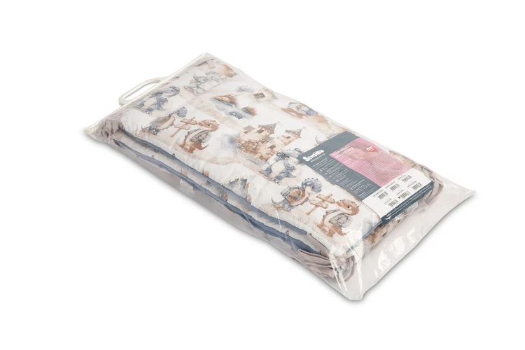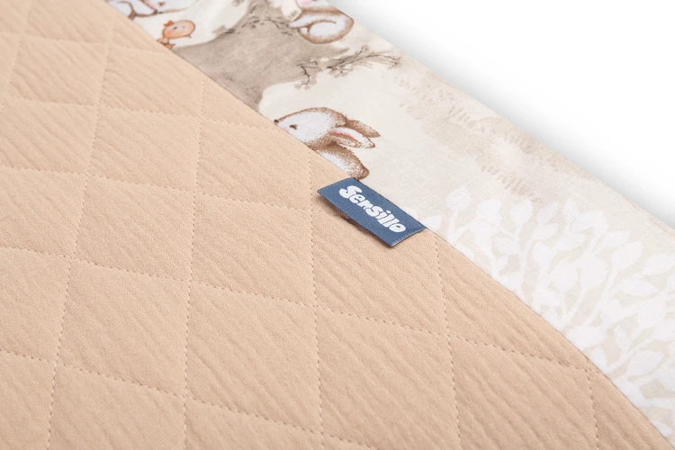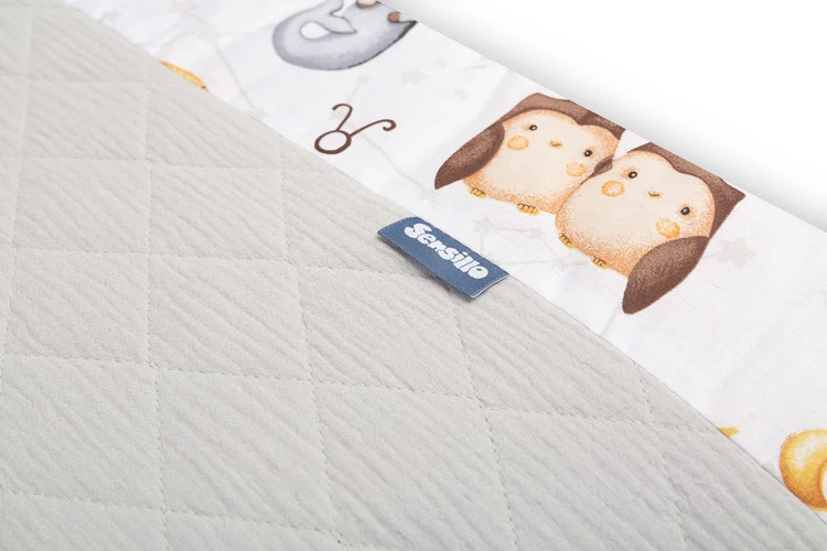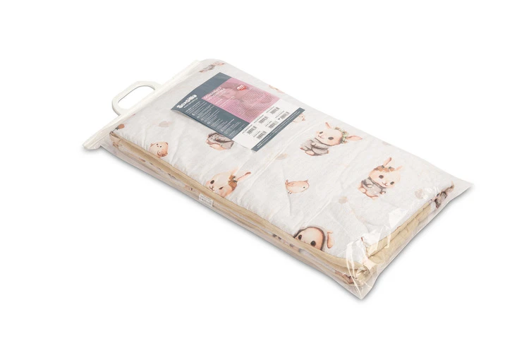 Mantinel je vyrobený z mäkkej bavlny s potlačou a jemného mušelínu, ktorý je príjemný na dotyk. Výplň z polyesteru chráni dieťa pred prípadnými nárazmi o priečky postieľky. Pripevnenie pomocou praktických šnúrok zaisťuje, že mantinel vždy zostane na svojom mieste.