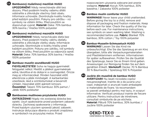 Materiál, z ktorého je Hugo ušitý, je veľmi kvalitný a spĺňa Oeko-tex® Standard 100. To znamená, že každá jedna zložka materiálu je pre dieťatko bezpečná a neobsahuje žiadne škodlivé látky.
