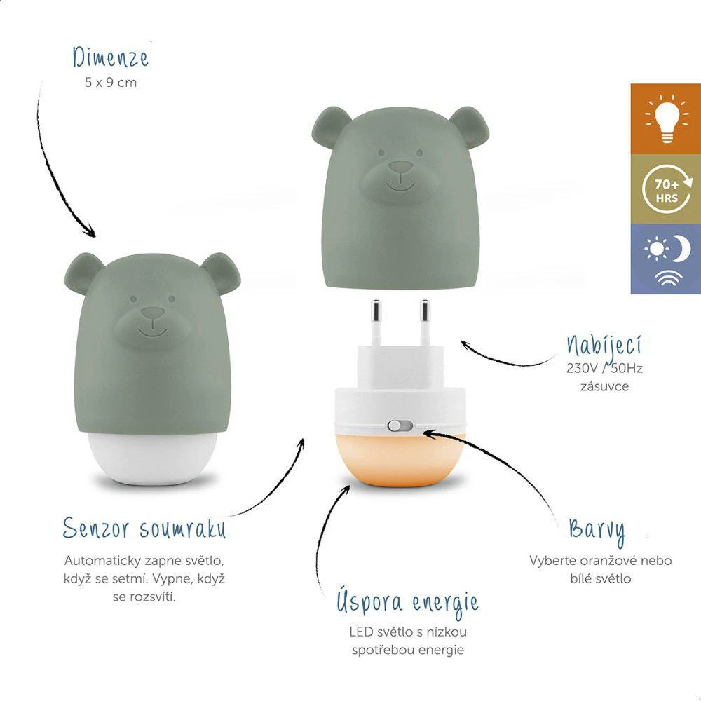 Medvedík BENNY je prenosné dobíjacie detské nočné svetlo, ktoré sa automaticky zapne, keď sa zotmie, a vypne, keď sa rozední.