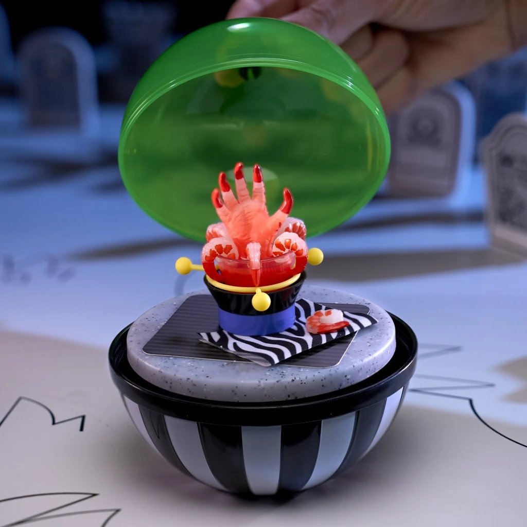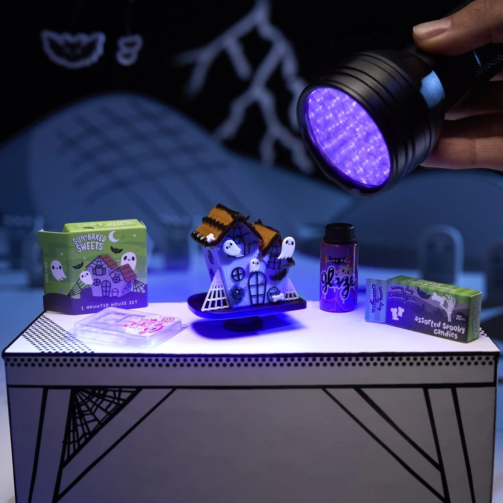 V balení nájdeš ingrediencie, ktoré zmiešaš podľa návodu, a potom necháš výtvor aspoň 5 minút vytvrdnúť na priamom slnku alebo pod 365nm UV svetlom. V tejto sérii môžeš vytvoriť napríklad strašidelný dom, vyrezávané tekvice, nápoj duchov alebo vzácne Beetlejuice krevety. Hotové mini pokrmy môžeš servírovať alebo vystaviť ako súčasť zbierky.