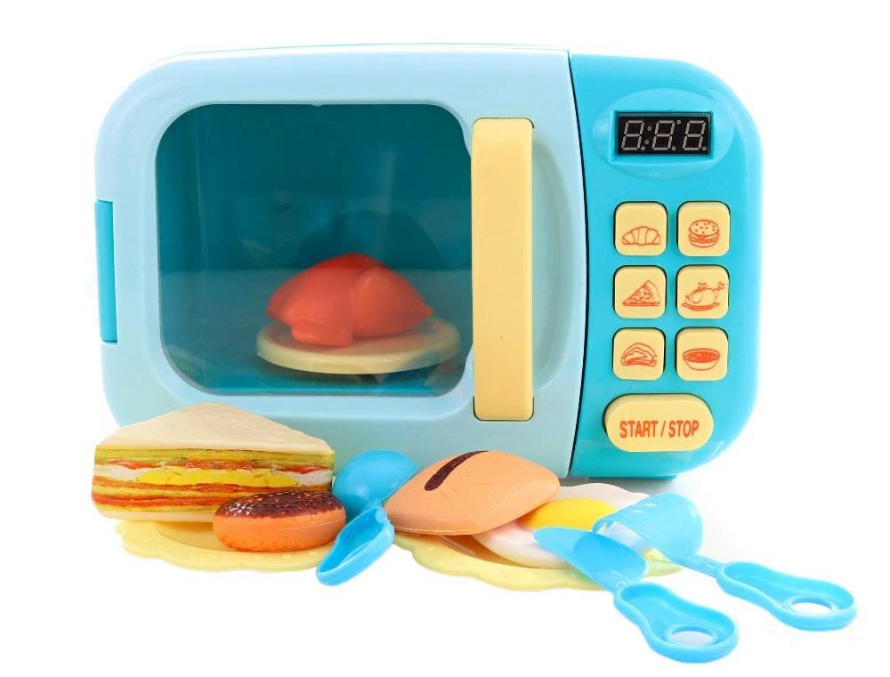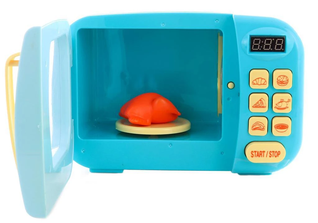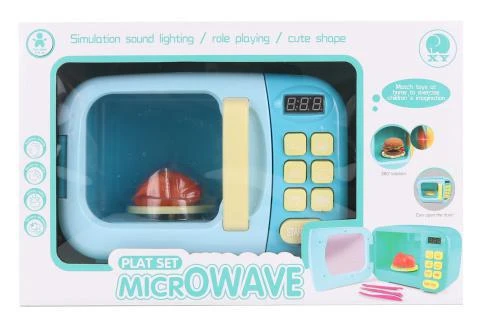 Mikrovlnná rúra na batérie. Plastová rúra na batérie. Rúra vydáva reálne zvuky a svieti rovnako ako pri ohrievaní, točí sa jej vnútorná časť.