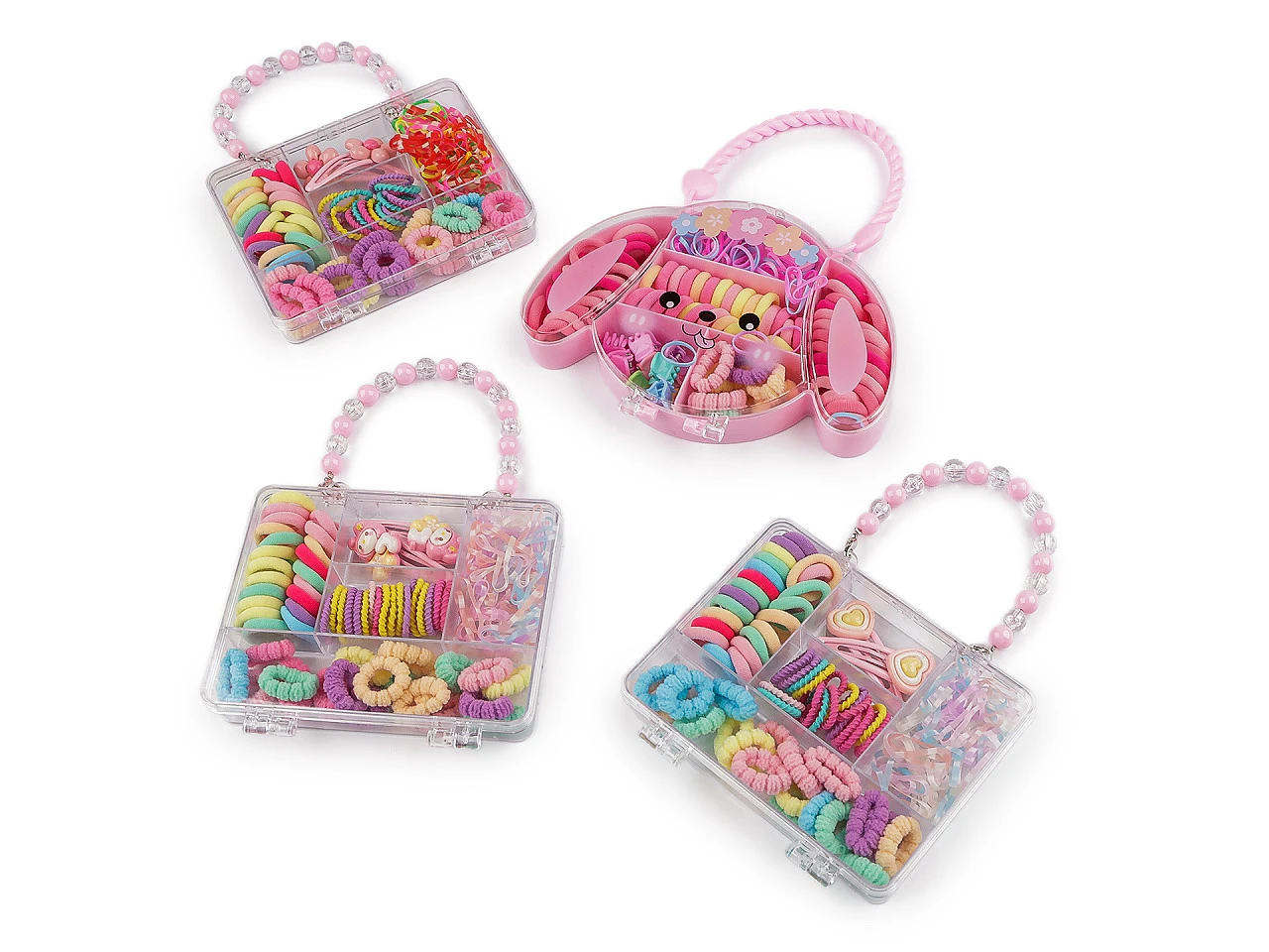 Sada č. 1 (tvar kufra) obsahuje sponky pukačky s ozdobou a kombináciu silikónových aj textilných gumičiek rôznych veľkostí .