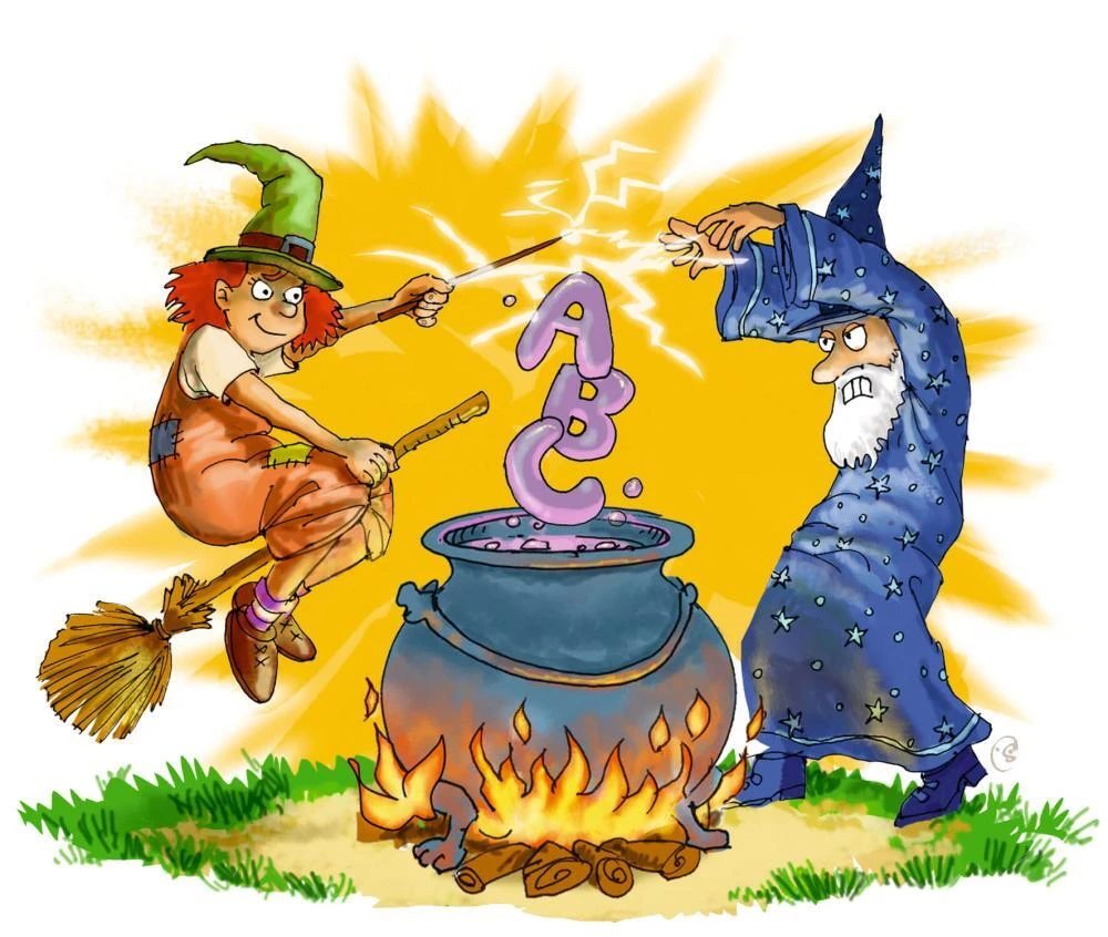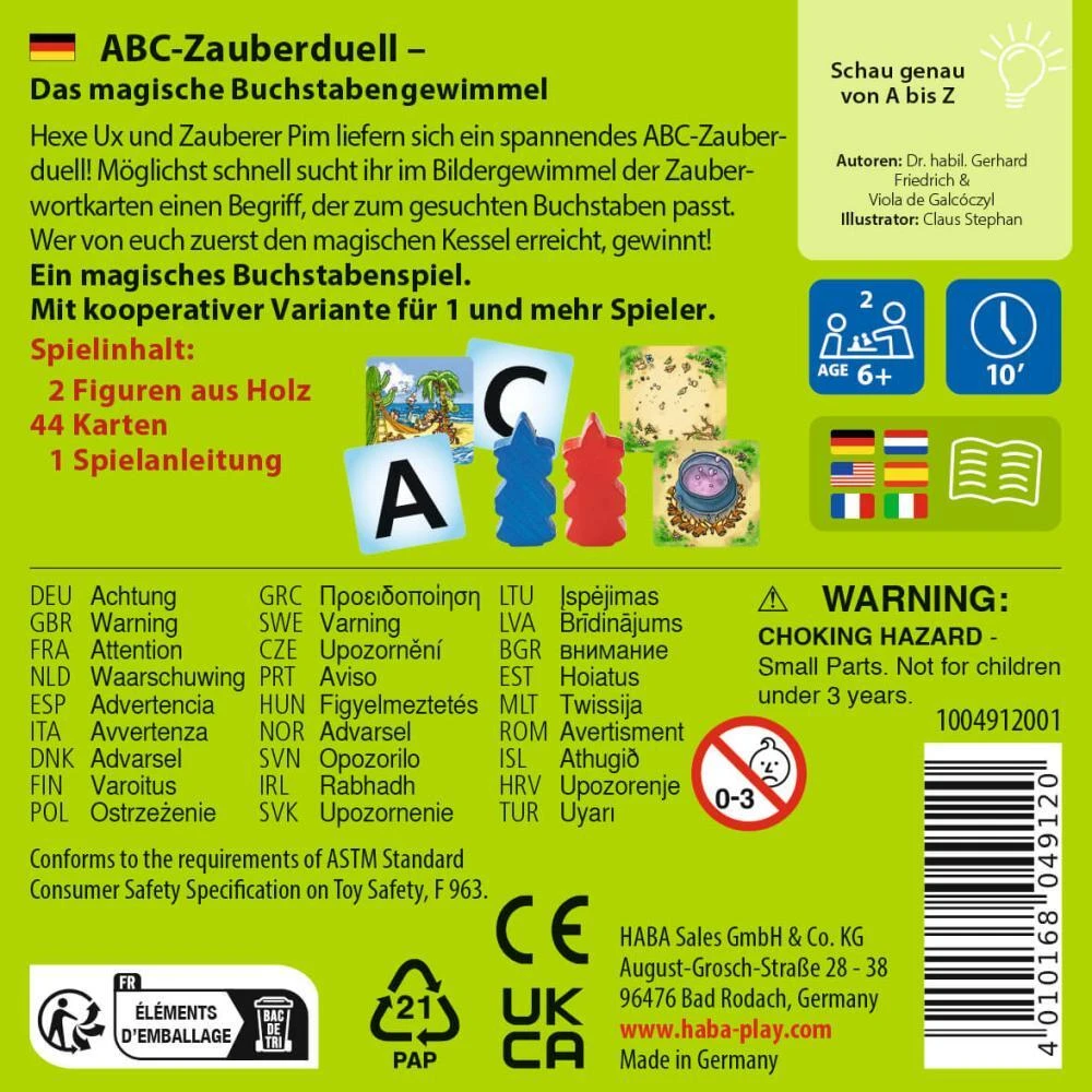 Čarodejnica a čarodejník sa v temnom zakliatom lese postavia proti sebe v vzrušujúcej súťaži: Ktorý z dvoch kúzelníkov pozná najsilnejšie kúzelné slovo? Len s rušnou kartou s kúzelným slovom, kartou s písmenami a zábavou pri hľadaní slov je možné ho nájsť. Aby hráči vyhrali tento zložitý súboj ABC, musia rýchlo nájsť kúzelné slovo. K tomu odhalí kartičku s písmenkom a kartičku s kúzelným slovíčkom. Teraz každý súčasne hľadá slovo na obrázku skrytého predmetu na karte kúzelného slova, ktorý začína odhaleným písmenom. Kto žiari dobrým okom a rýchlymi reakciami? Len tak môže hráč vyhrať magický súboj ABC medzi čarodejnicou a čarodejníkom.