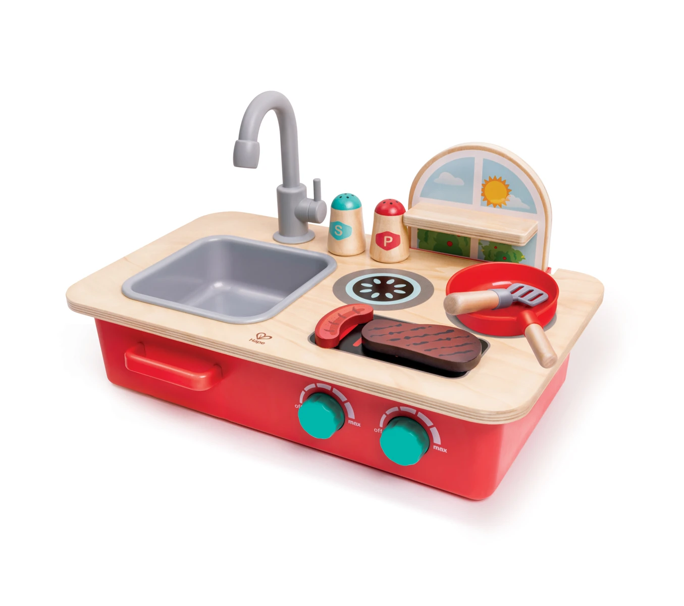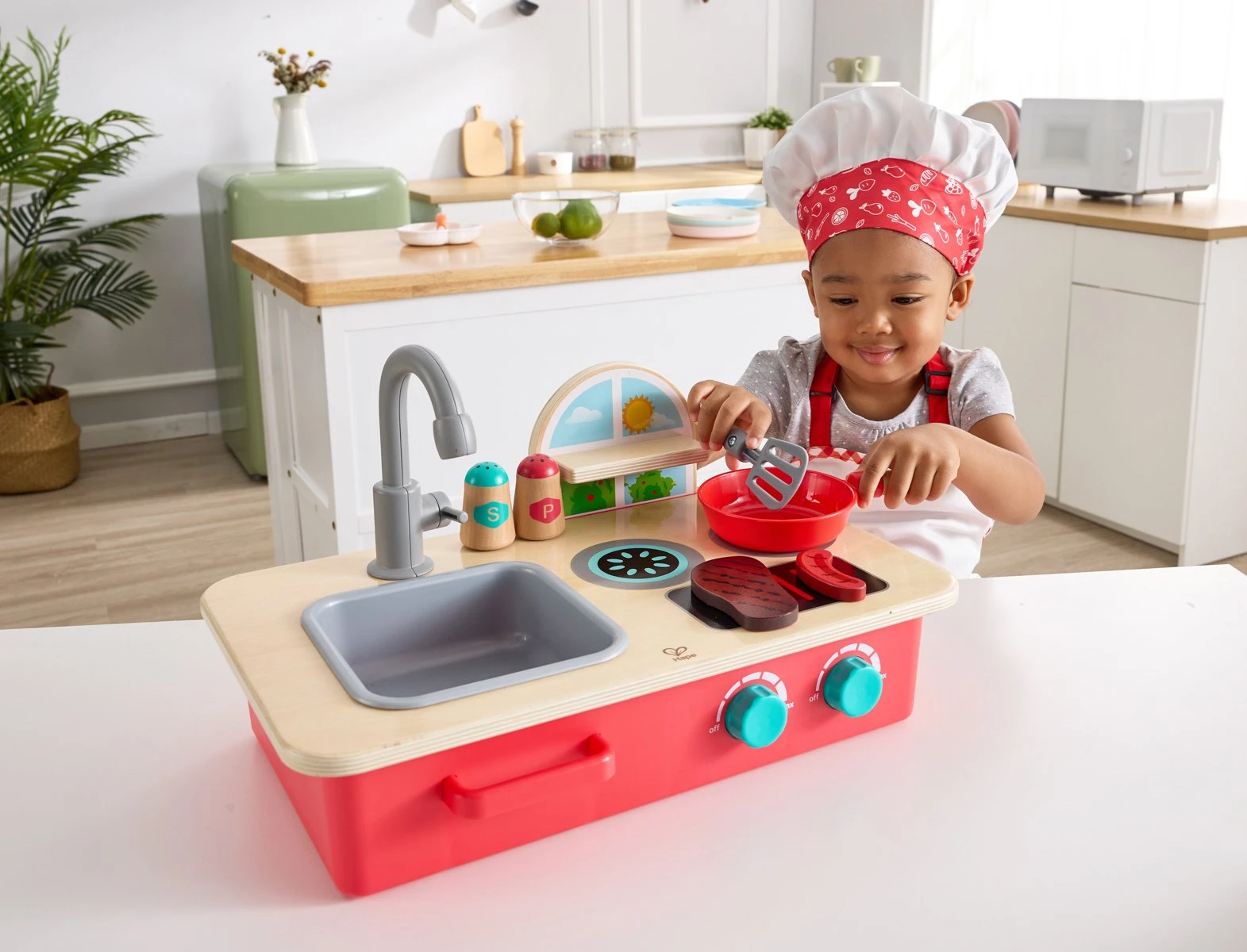 Kuchynka Cook & Create - stolná sada na varenie. Drevená kuchynská hračka so zvukmi, nastaviteľným drezom, tabuľou na kreslenie a bohatým príslušenstvom na varenie vrátane potravín.