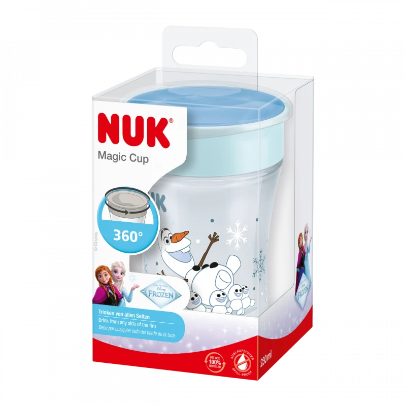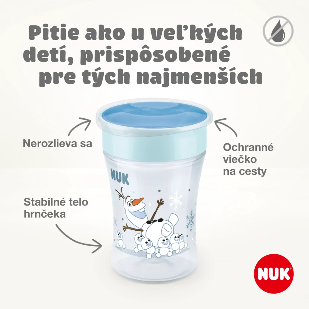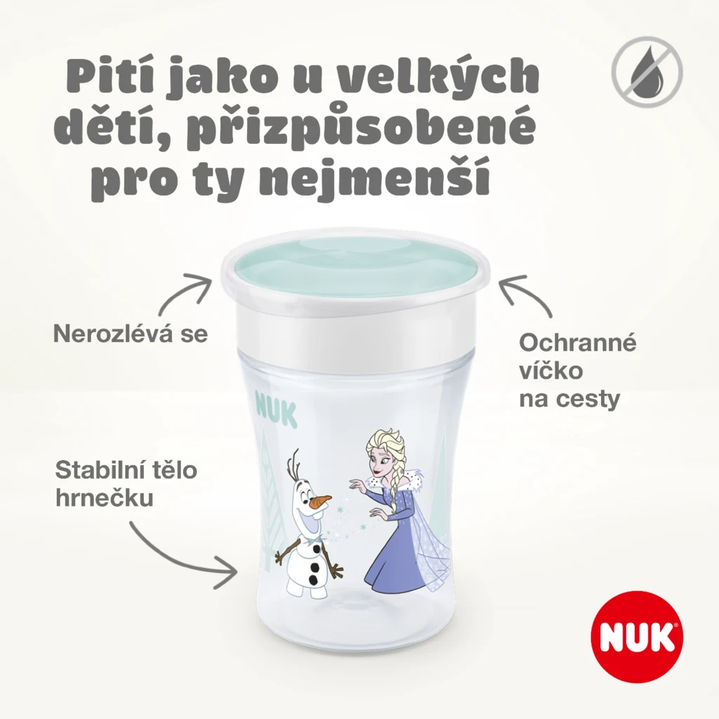 Hrnček NUK Magic Cup umožňuje malým deťom piť ako veľké deti. 360° pitný okraj podporuje a pomáha piť zo všetkých strán – žiadne držadlá a pitie takmer ako z normálneho hrnčeka. Jediný „kúzelný rozdiel“ je ten, že tekutina z hrnčeka nevytečie vďaka silikónovému disku, ktorý utesňuje viečko zvnútra. Pitie je detská hra - stačí jednoducho sať okraj hrnčeka.