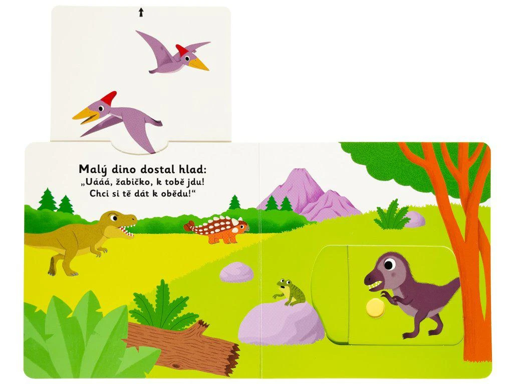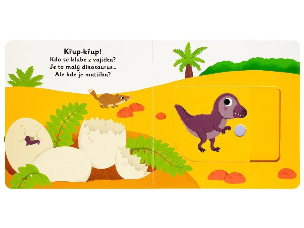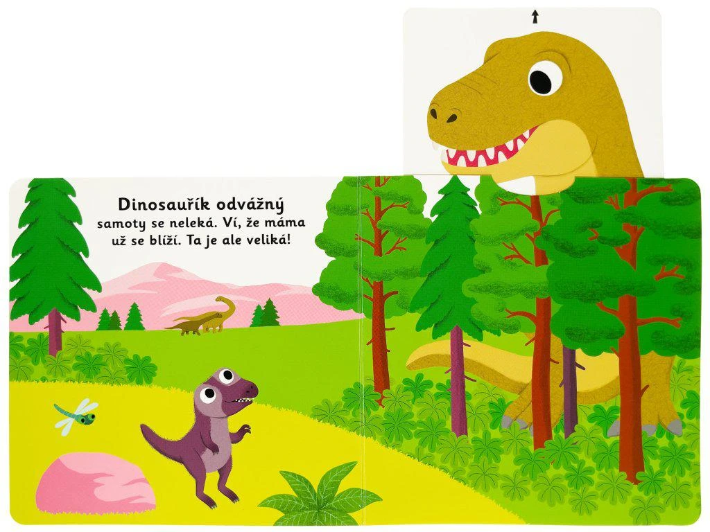 Dinosaurík odvážny samoty sa neľaká. Vie, že mama už sa blíži. Tá je ale veľká! Spoznajte príbeh o malom dinosaurovi v tomto veršovanom leporele s milými ilustráciami a pohyblivými prvkami. Objavovať svet s týmto leporelom pre najmenšie deti od jedného roka je tak zábavné! Pevné stránky s pohyblivými prvkami precvičia aj jemnú motoriku. Stačí len vložiť prstík do správneho otvoru a zľahka vysunúť, zatiahnuť alebo otočiť a hneď bude váš malý objaviteľ poznať odpoveď na to, ako prebieha deň malého dinosaura.