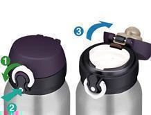 Otvorenie termosky je veľmi rýchle a jednoduché. Termosku otvorte iba jednou rukou. Postup: 1 - odistenie zámku, 2 - stlačenie spodnej časti tlačidla, 3 - viečko termosky sa otvorí. Otvorenie termosky jednou rukou oceníte všade tam, kde potrebujete aspoň jednu ruku voľnú - v aute, na vleku atď. Termosku zatvorte zaklapnutím viečka - môžete ju opäť zaistiť zámkom.