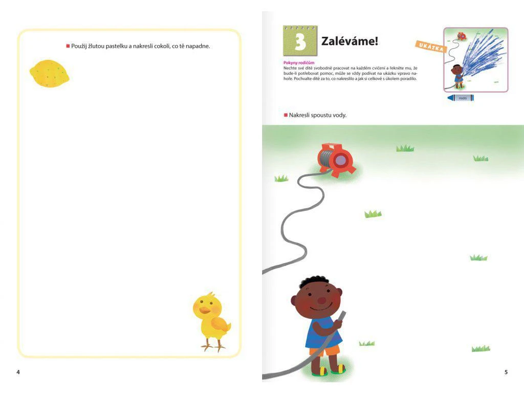 Tento pracovný zošit Kumon nadväzuje na úvodné dva pracovné zošity Spájanie a Úžasné spájanie. Jeho zámerom je naučiť dieťa poznať farby a zoznámiť ho s používaním písacieho náčinia. Pokiaľ vaše dieťa už začína kresliť, v tomto zošite sa bude učiť, ako pracovať s pastelkou, čím sa následne zlepší aj schopnosť používať ceruzku a získavať ďalšie písacie zručnosti. Vaše dieťa začne najskôr s jednoduchými cvičeniami, kde bude čmárať na veľkej ploche. Potom bude kresliť rôzne druhy čiar podľa vyznačených trás. Postupne budú tieto trasy užšie a dlhšie a ich tvary náročnejšie. Vaše dieťa si pri práci na týchto aktivitách užije veľa zábavy, zoznámi sa s názvami farieb, naučí sa lepšie sústrediť, správne držať pastelku v ruke a kresliť čiaru vyznačeným smerom.