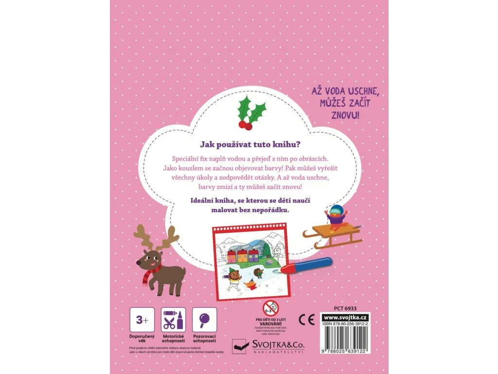 Naplň špeciálnu fixku vodou a ponor sa do kúzelného zimného sveta. Môžeš vyfarbovať stránky tejto roztomilo ilustrovanej knižky zas a znova, bez neporiadku. Na stránkach ťa čakajú zábavné úlohy a otázky inšpirované zimným obdobím a dobrodružstvom vtáčika Vítka. Dokážeš nájsť Vítka v zasneženom lese? Spočítaj snehové vločky na zamrznutom rybníku, kde sa korčuľuje! Poznáš, akú farbu má králikov sveter a kde sa skrýva líška? Akonáhle voda uschne, farby zázračne zmiznú a ty môžeš vyfarbovať a riešiť zimné hádanky stále dookola! Ideálne pre rozvoj pozornosti, jemnej motoriky a spoznávania zimy.