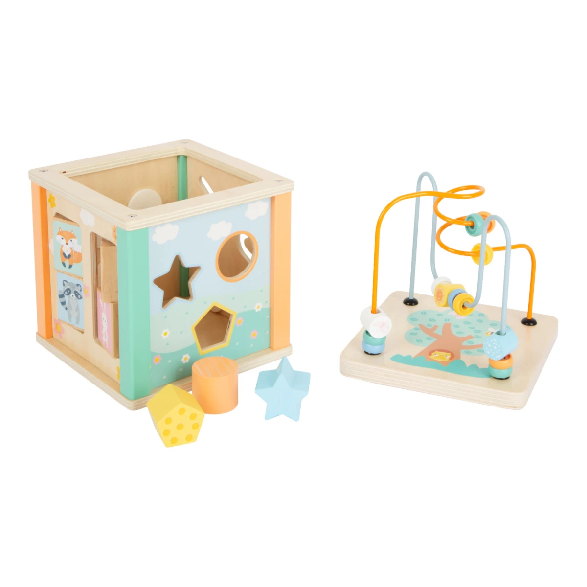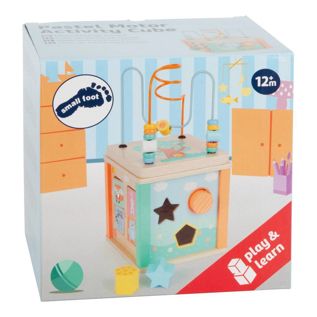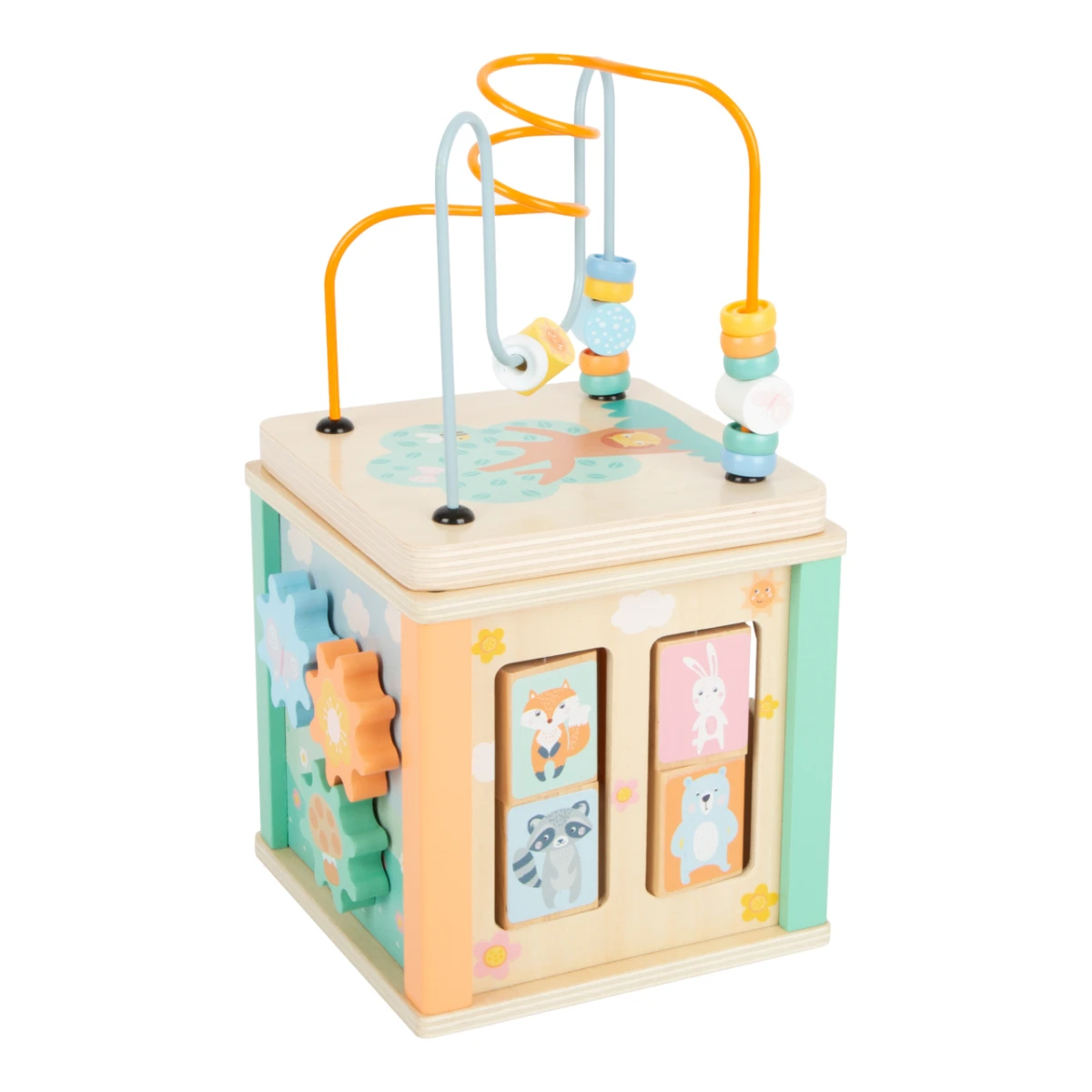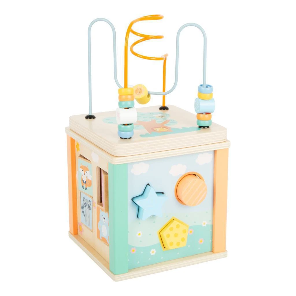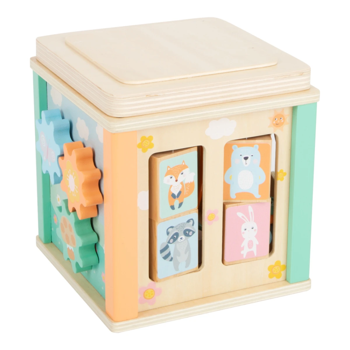 Skladajte, strkajte, klapte, otáčajte! Môžete sa hrať zo všetkých piatich strán! Drevená motoriká kocka ponúkne zábavu aj najmenším deťom.