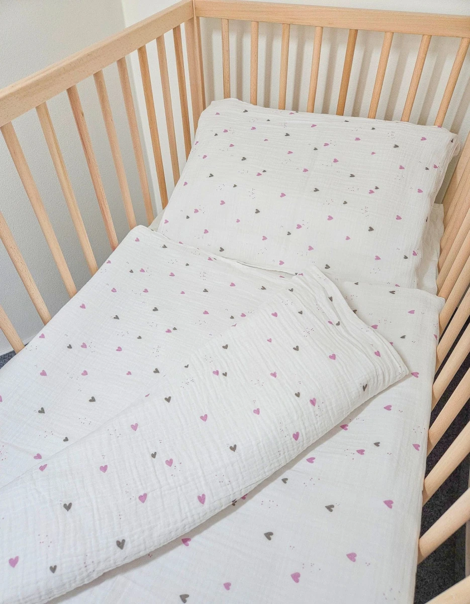 Mušelínové obliečky do detskej postieľky 90x130 cm + 45x60 cm Prem Fialové srdiečka