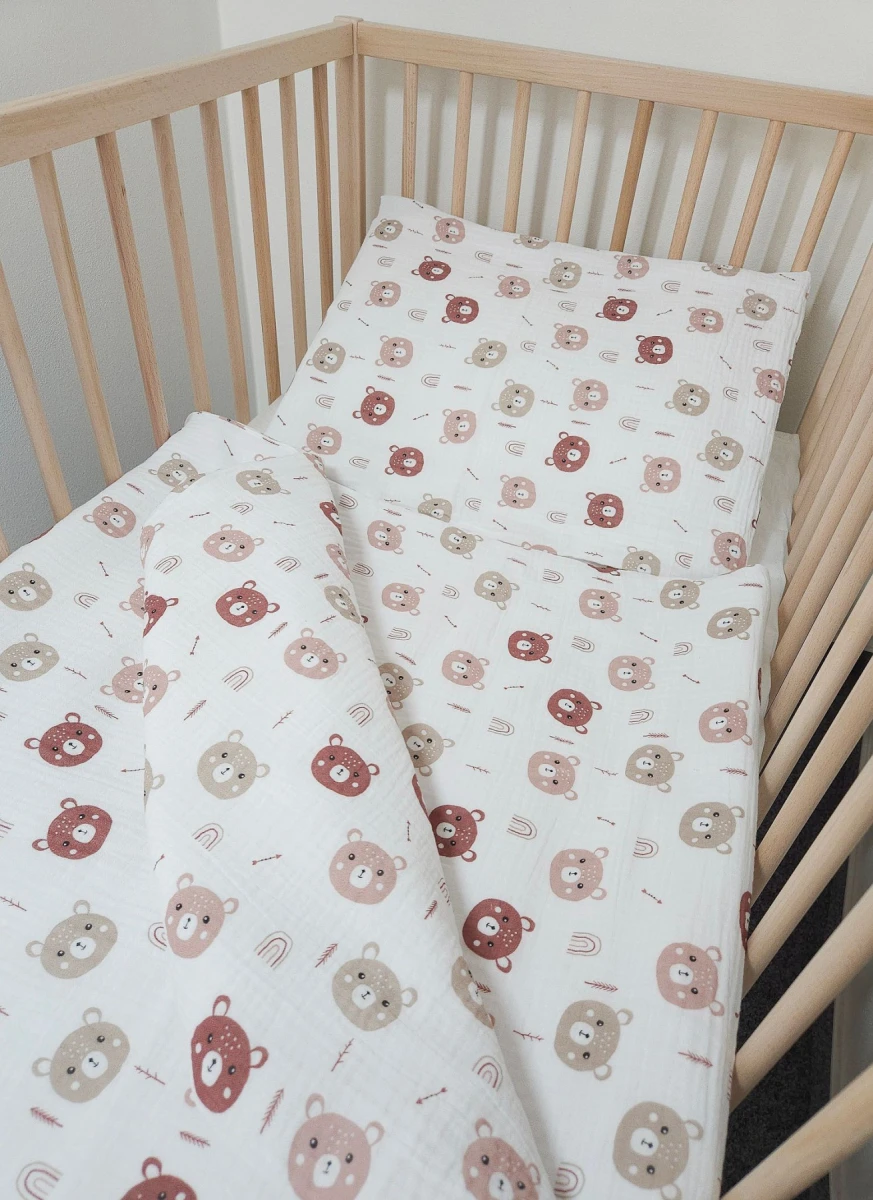Mušelínové obliečky do detskej postieľky 90x130 cm + 45x60 cm Prem Méďa šíp