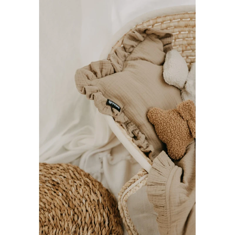 Zariaďujete izbičku alebo možno len pozeráte po darčeku pre nastávajúcu mamičku? Verte, že z roztomilého mušelínového vankúšika, ktorý je ozdobený volánikom budete nadšení. Vankúšik je nízky a vhodný aj pre najmenšie bábätká. Mušelín je sám o sebe luxusný materiál, jeho mäkkučké vlastnosti ukolísajú každé bábätko do sladkého snívania.