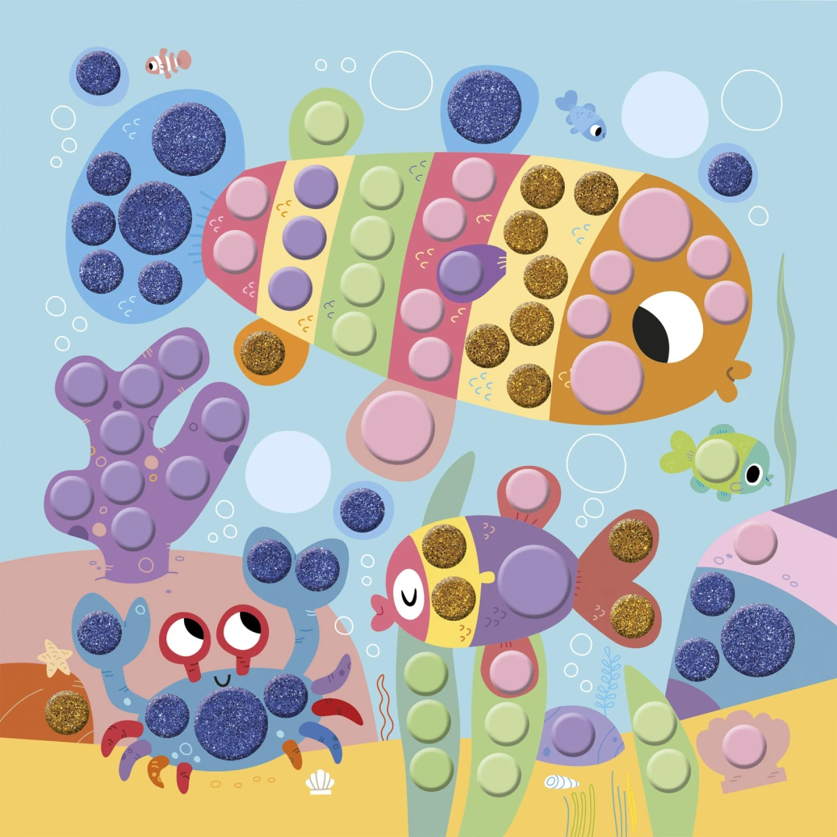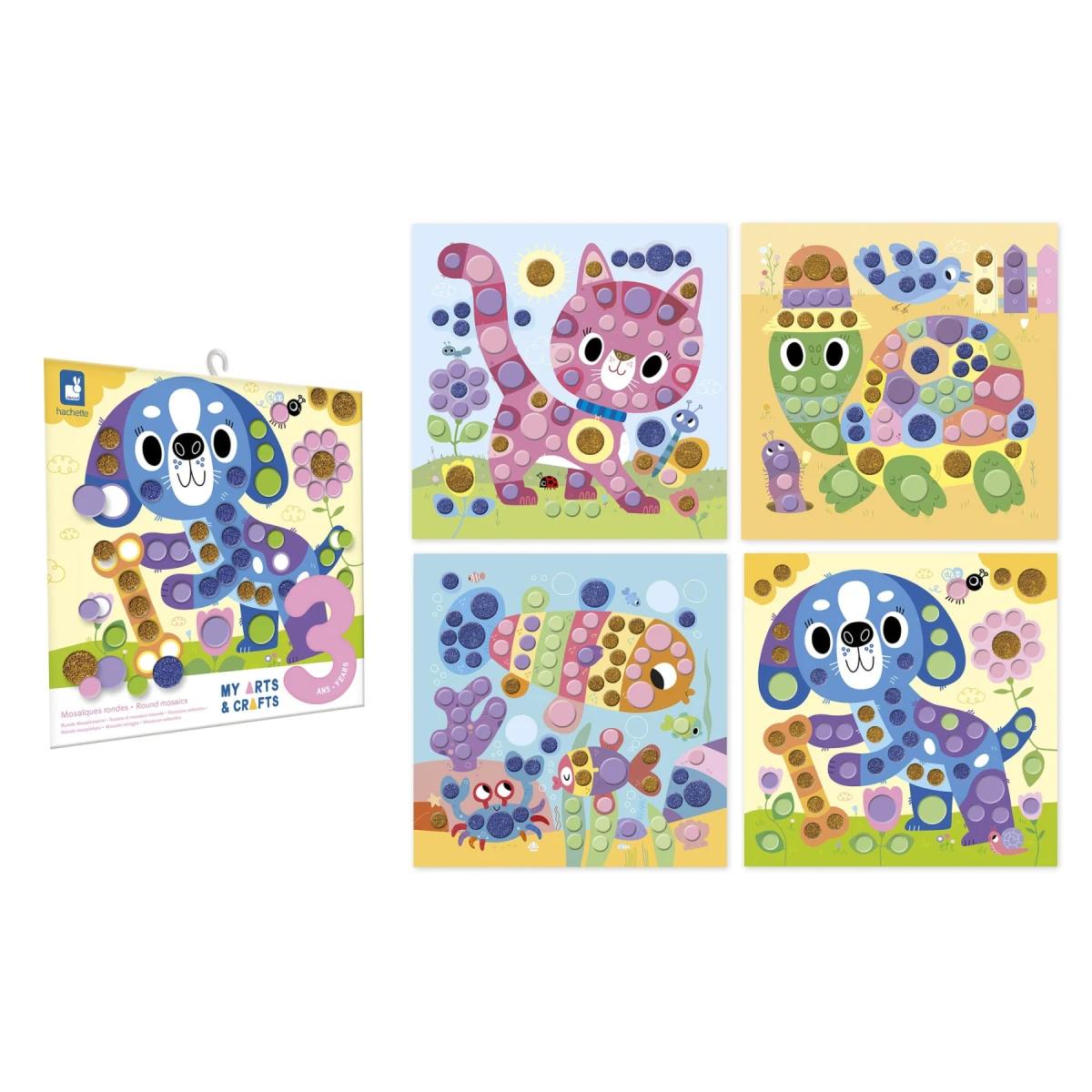 Obsahuje 4 obrázky s rozmermi 20 x 20 cm (mačka, pes, ryba a korytnačka), 5 listov okrúhlych penových mozaík v rôznych farbách a leták s návodom a vzormi.