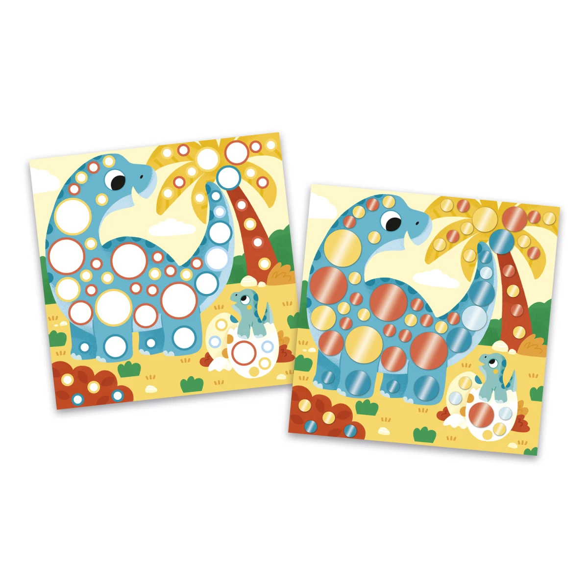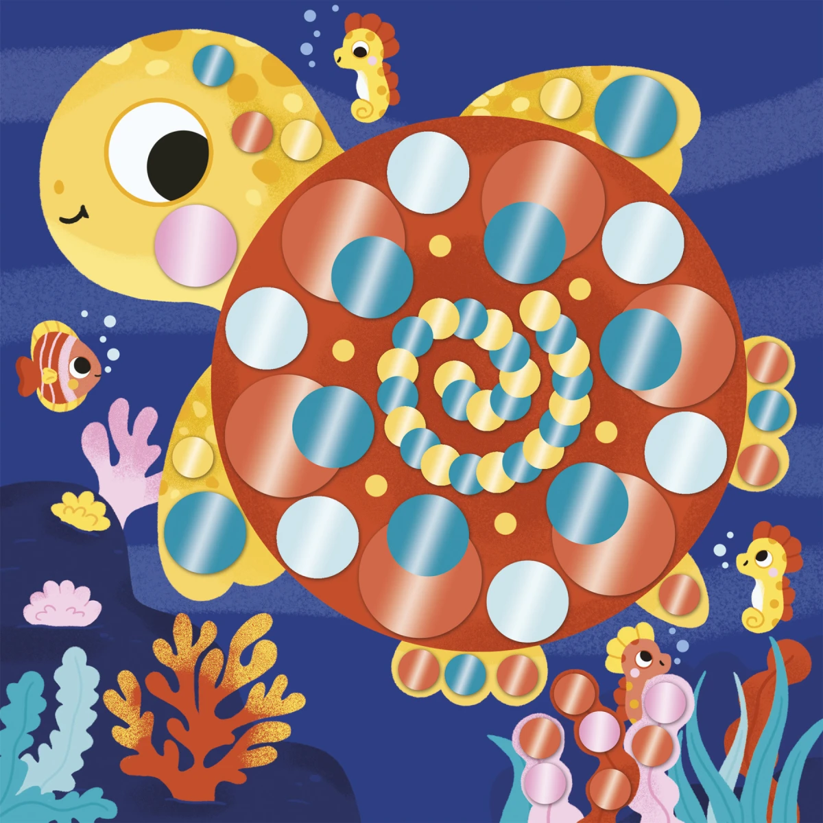 Obsahuje 4 podložky s rozmermi 20 x 20 cm (páv, dinosaurus, leopard a morská korytnačka), 4 listy kovových nálepiek v tvare bodiek v 3 rôznych veľkostiach (30, 20 a 10 mm) a leták s návodom a vzormi.