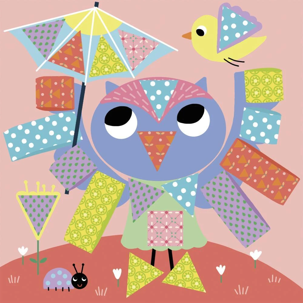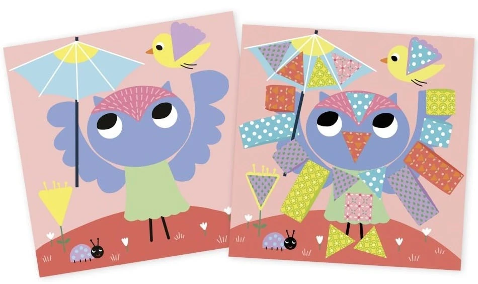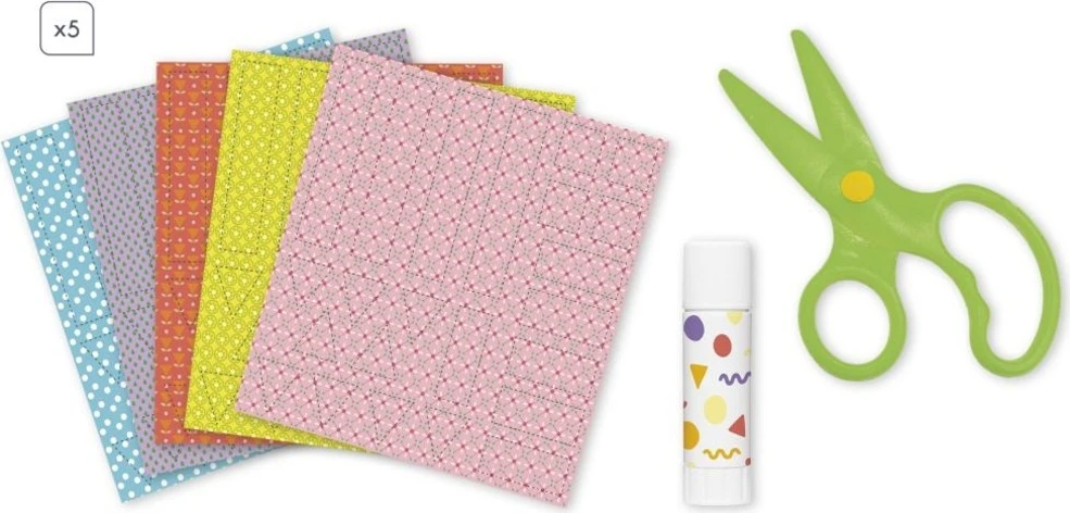 Súčasťou balenia sú bezpečné detské nožnice (strihajú iba papier) a 5 hárkov vzorovaného papiera, ktoré podporia kreativitu začínajúcich umelcov. Aktivita je veľmi jednoduchá: stačí vystrihnúť predkreslené tvary z papiera a pomocou priloženej lepiacej tyčinky ich umiestniť na správne miesto. Deti môžu postupovať aj podľa návodu v brožúre.