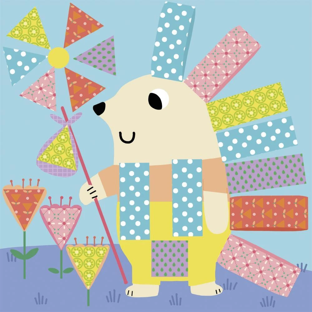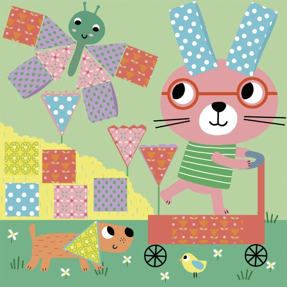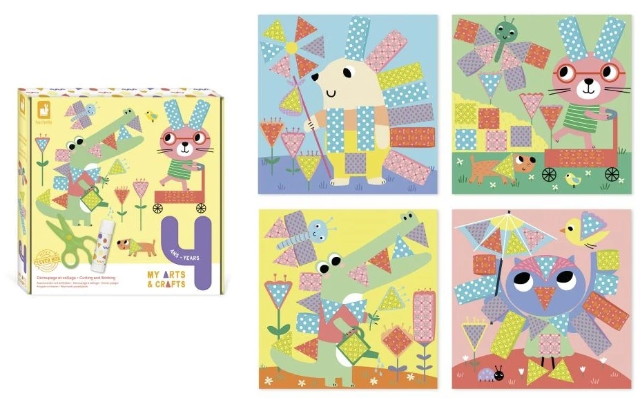 Úlohou tejto sady je vystrihnúť a nalepiť vzorované papieriky na pozadí so zvieratkami a dokončiť tak obrázok. Deti sa zabavia doplňovaním farebných scén s motívmi zvierat, ako je ježko, králik alebo krokodíl. Nožnice sú bezpečné pre deti a strihajú iba papier. Dokončenie všetkých 4 obrázkov trvá približne 1,5 hodiny.