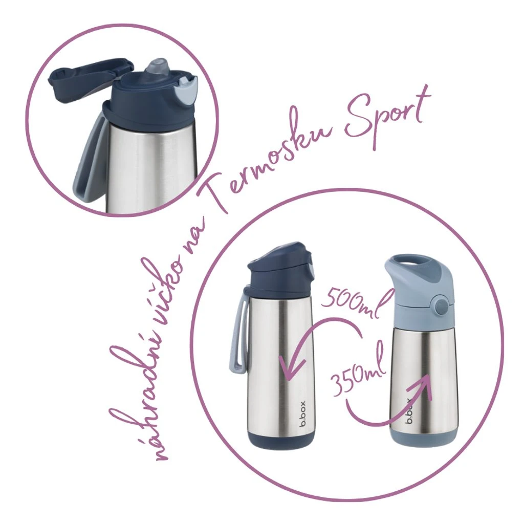 Náhradné viečko je vhodné na základňu termosky na pitie šport značky b.box . Viečko je plne kompatibilné aj so základňou termosky so slamkou, a to na malú verziu s objemom 350 ml alebo väčšou s objemom 500 ml .