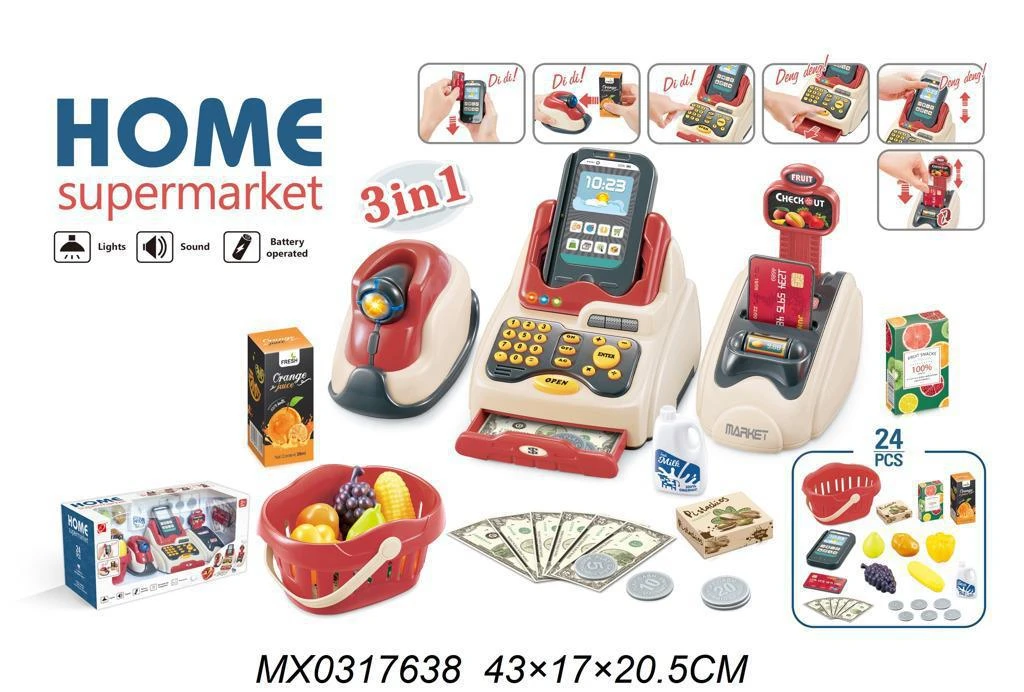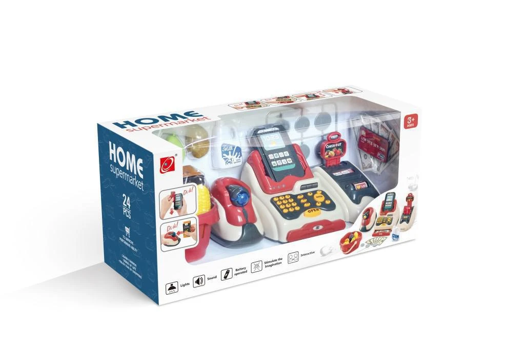Súčasťou sady je pokladňa, čítačka, platobný terminál, nákupný košík, peniaze, nákup. Sada svieti a vydáva zvuky.