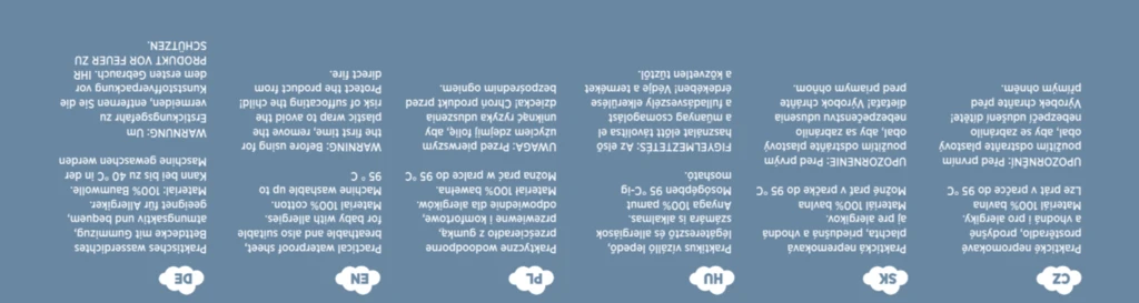 UPOZORNENIE Pred prvým použitím odstráňte plastový obal, aby sa zabránilo nebezpečenstvu udusenia dieťaťa. Výrobok chráňte pred ohňom.