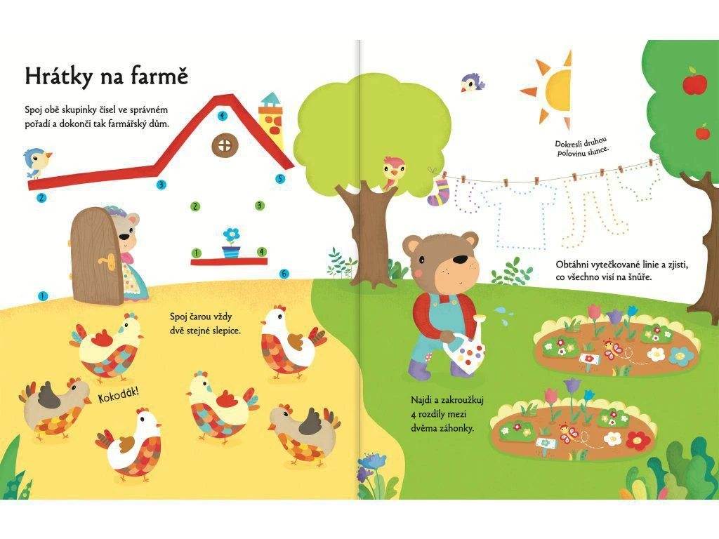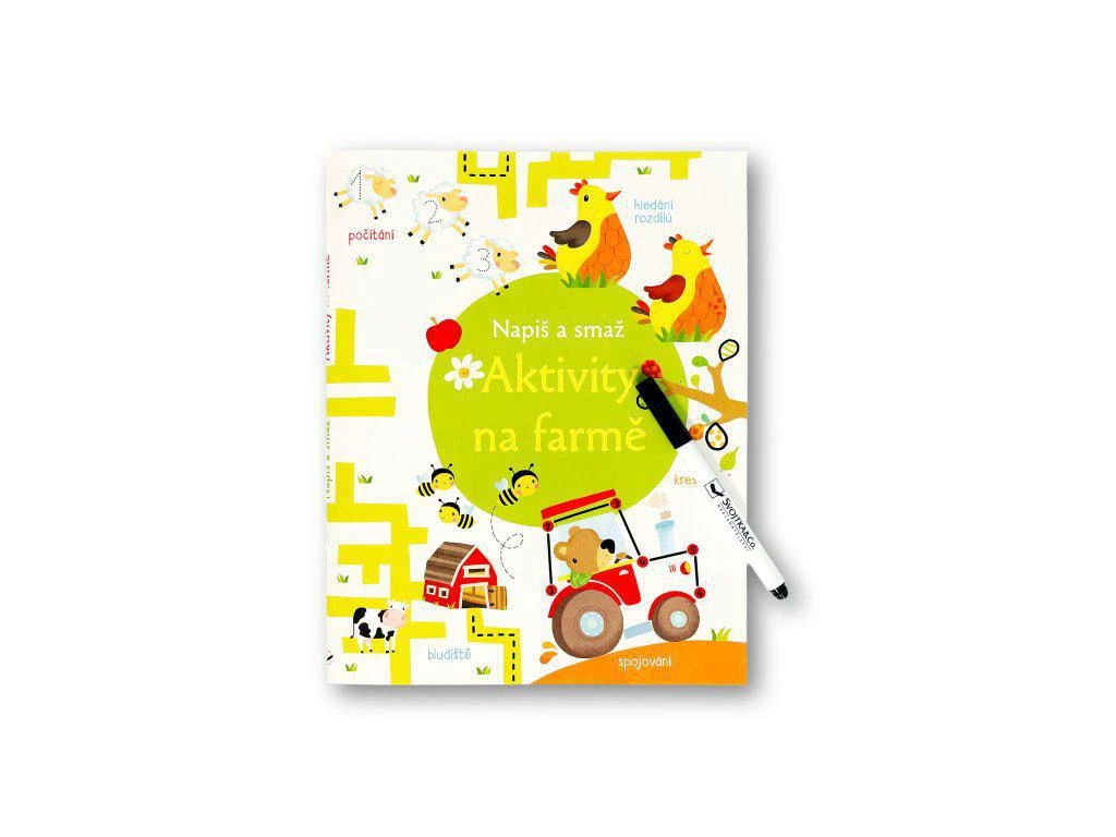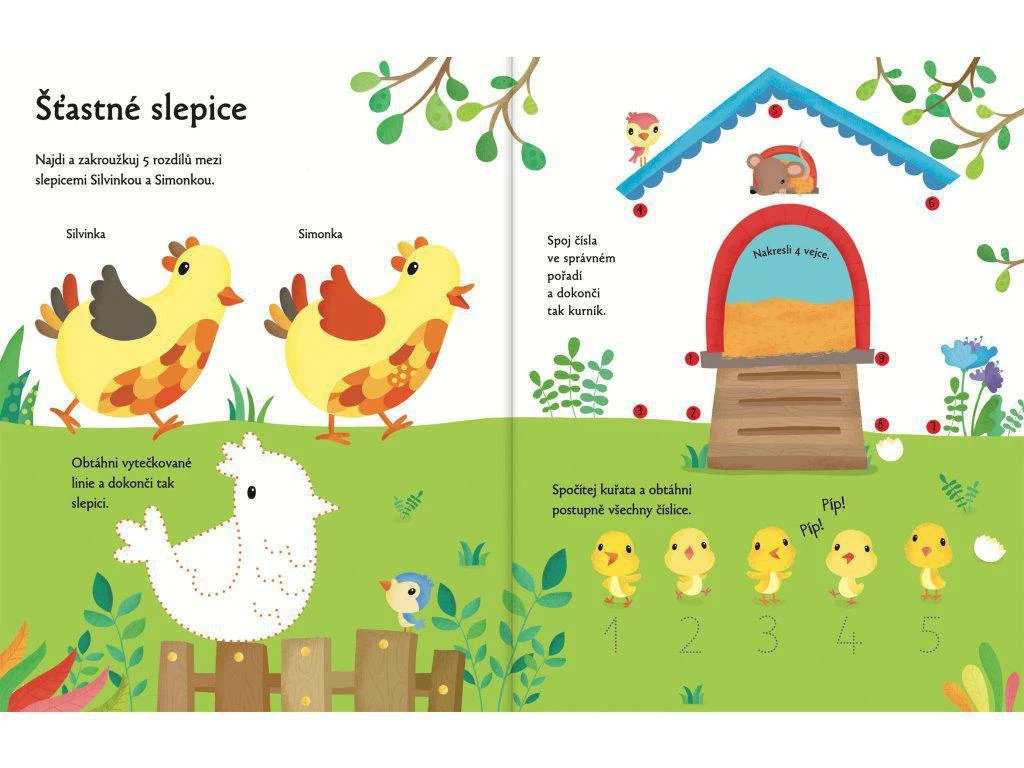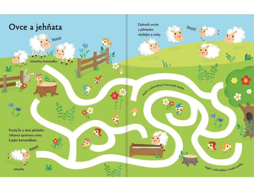 Nahliadni do knihy zábavných aktivít so zvieratkami z farmy, vezmi si stierateľnú fixku a pomôž zvieratkám vyriešiť úlohy.