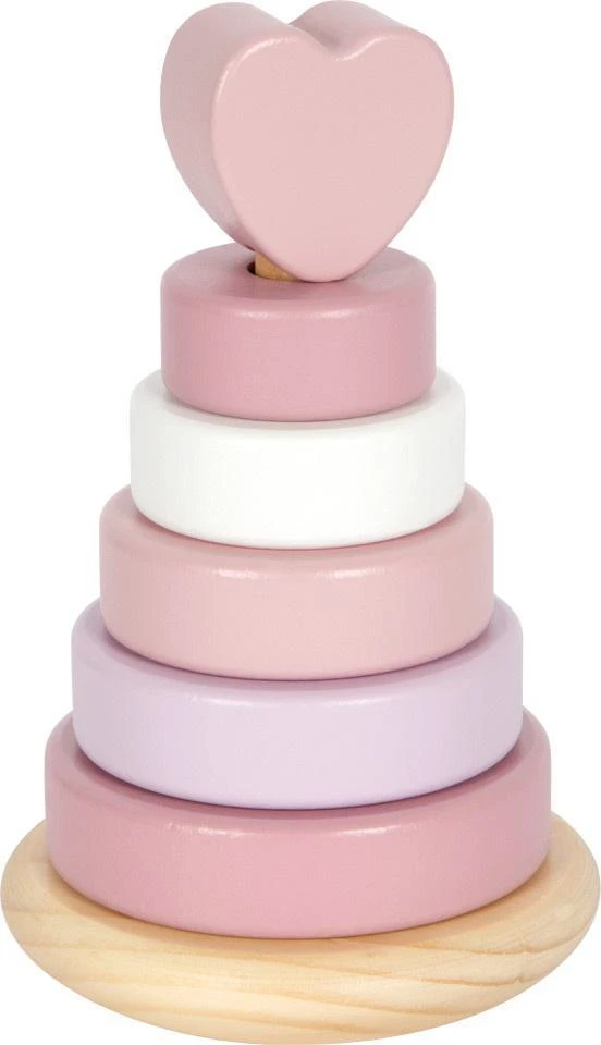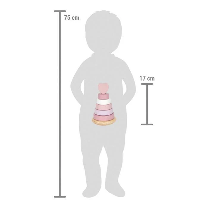 Táto drevená stohovacia veža v jemných pastelových odtieňoch ružovej s prírodnými prvkami je zakončená srdcom, ktoré hračke dodáva osobité kúzlo.