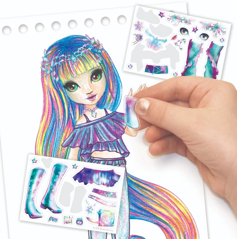 Súčasťou setu je 20 stránok s náčrtkami postavy, 2 stránky so šablónami, ktoré ponúkajú celkom 28 rôznych tvarov oblečenia, 6 hárkov so samolepkami (celkom 100 samolepiek), 10 farebných pasteliek a obrázkový návod. Blok má magnetické zatváranie, takže sa obsah vo vnútri bezpečne neotvorí.